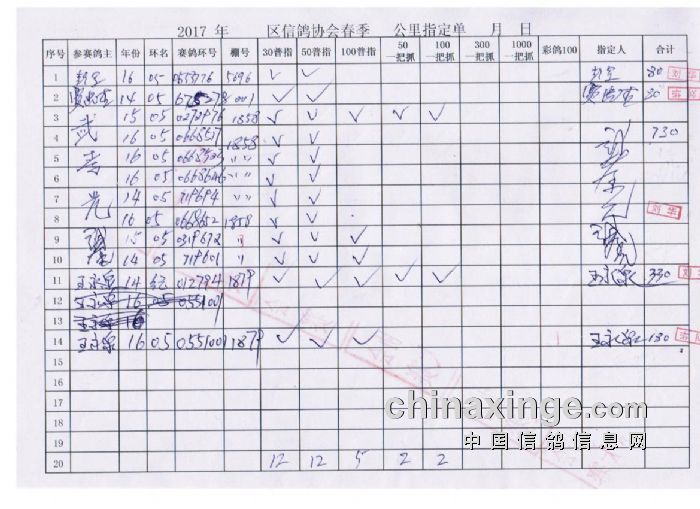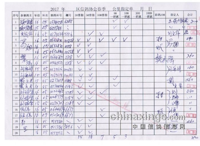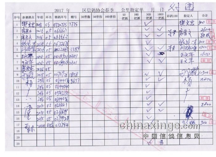 青山区信鸽协会2017年春季500公里第一场指定明细