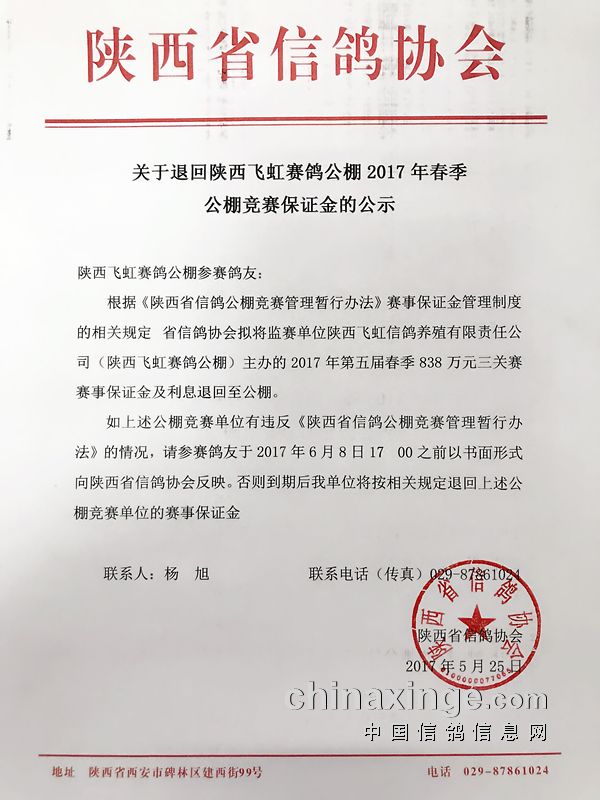 关于退回陕西飞虹赛鸽公棚2017年春季公棚竞赛保证金的公示