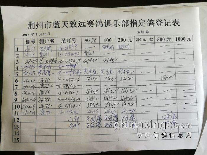 2017年5月26日700公里安阳站比赛指定鸽明细