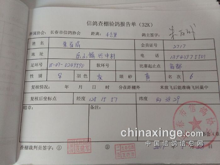 在2017年春季1000公里比赛过程中,鸽主:朱百成 环号:15-07-0249590 赛鸽归巢后死亡,按照信鸽竞赛规则与裁判法第13页第十六条第2款规定其成绩无效。