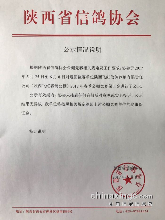 退回陕西飞虹赛鸽公棚2017年春季竞赛保证金公示情况说明