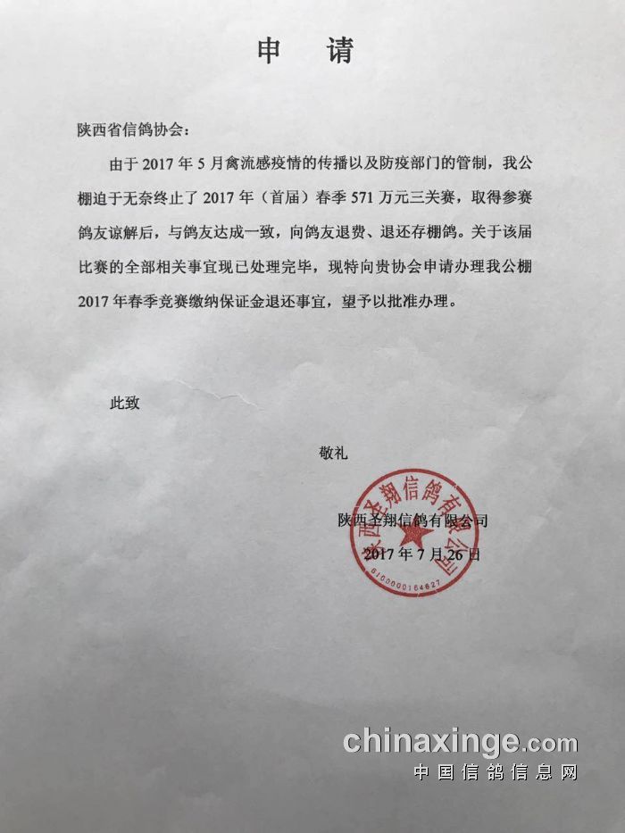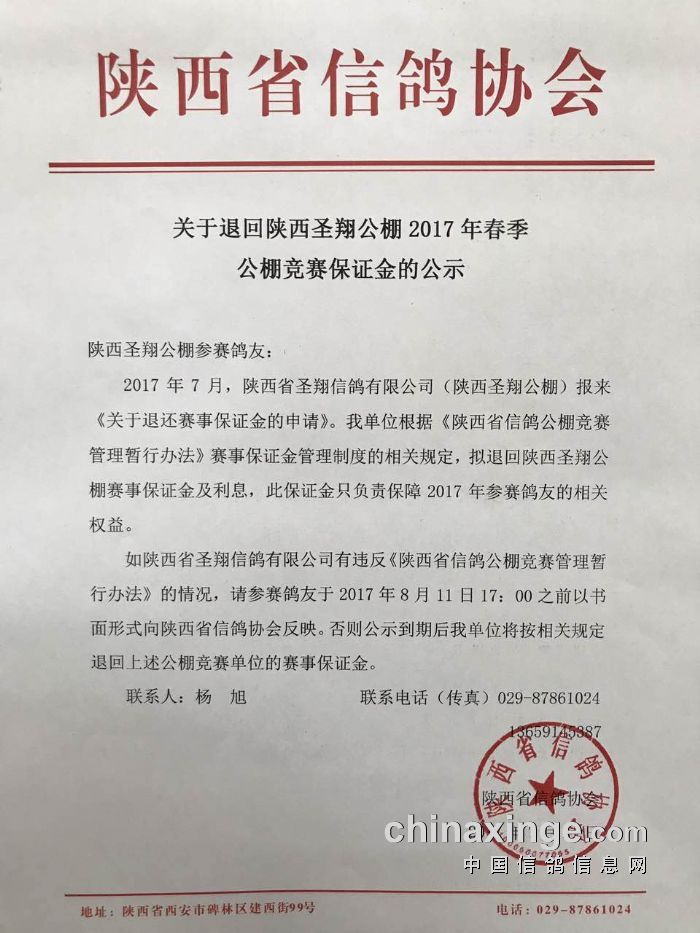 关于退回陕西圣翔公棚2017年春季公棚竞赛保证金的公示