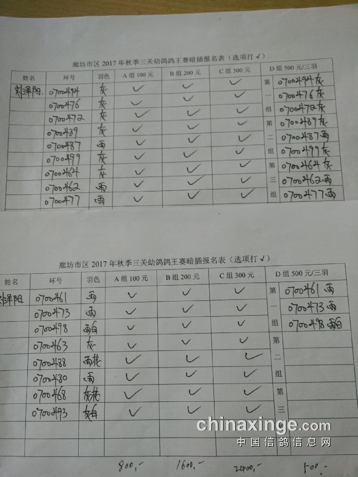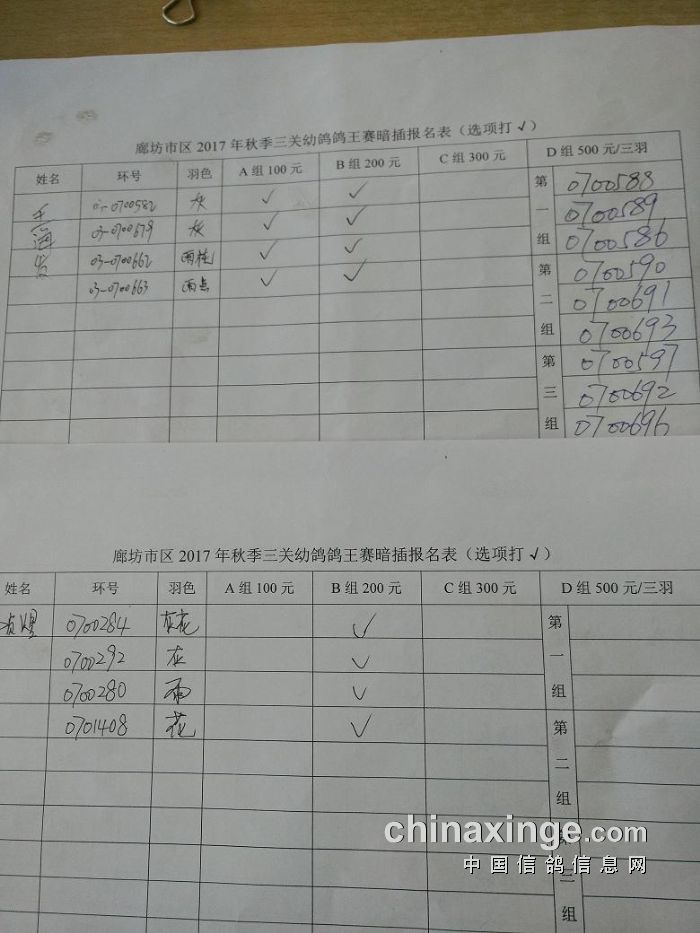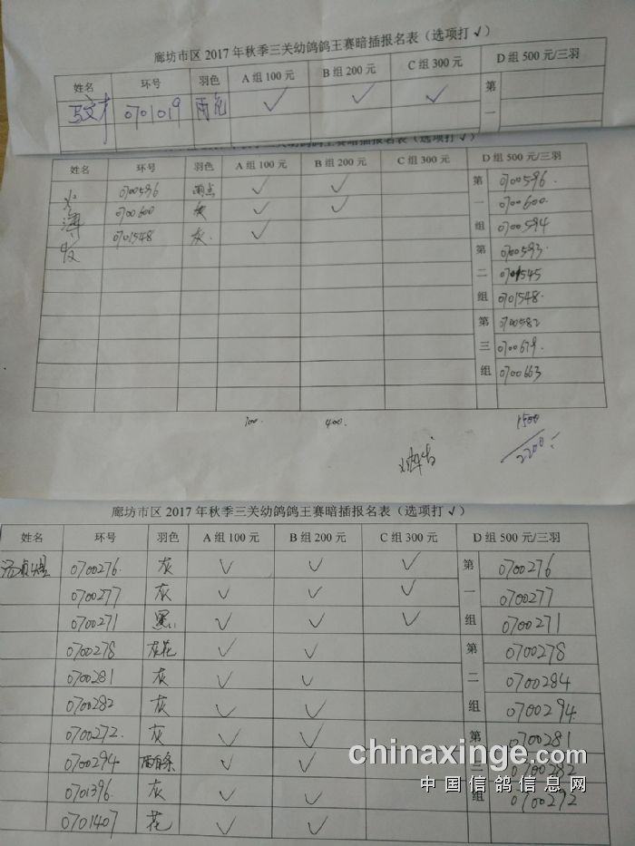 廊坊信鸽协会200公里比赛集鸽清单