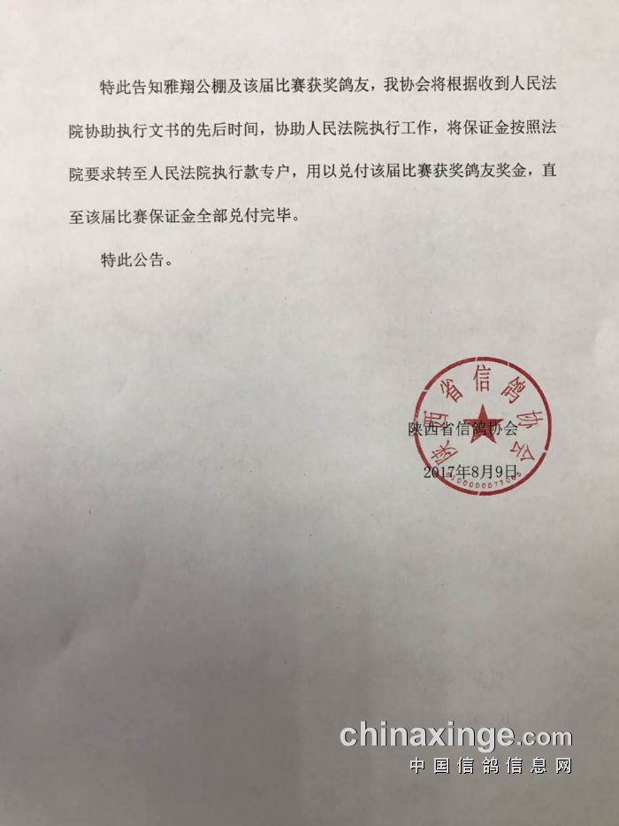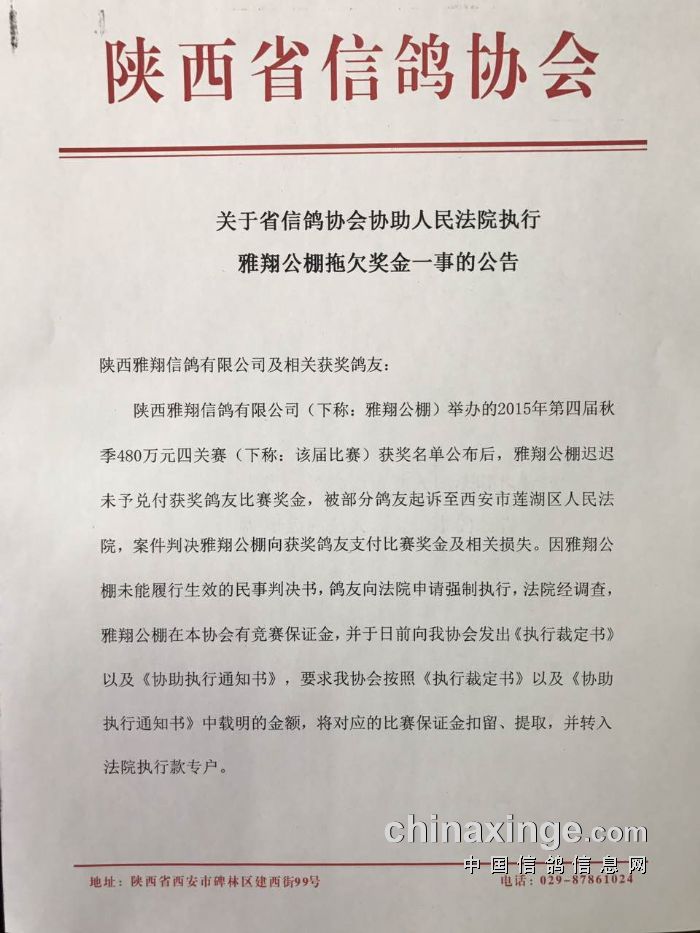 关于省信鸽协会协助人民法院执行雅翔公棚拖欠奖金一事的公告