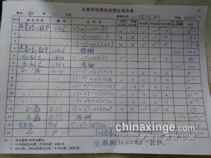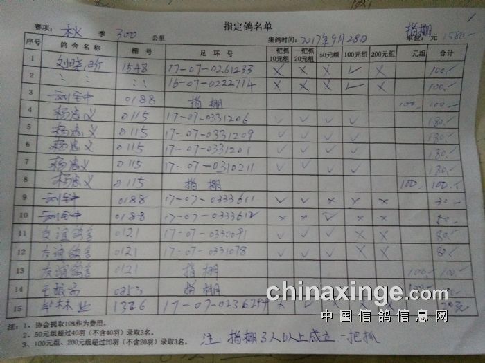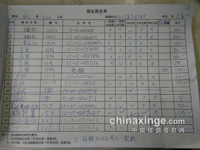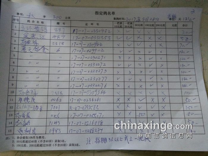 2017年秋季300公里比赛暨大奖第二关指定鸽明细