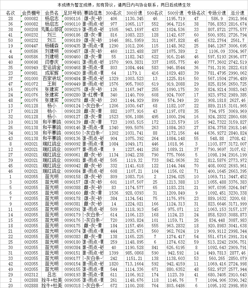2017年幼鸽大赛成绩(按名次)