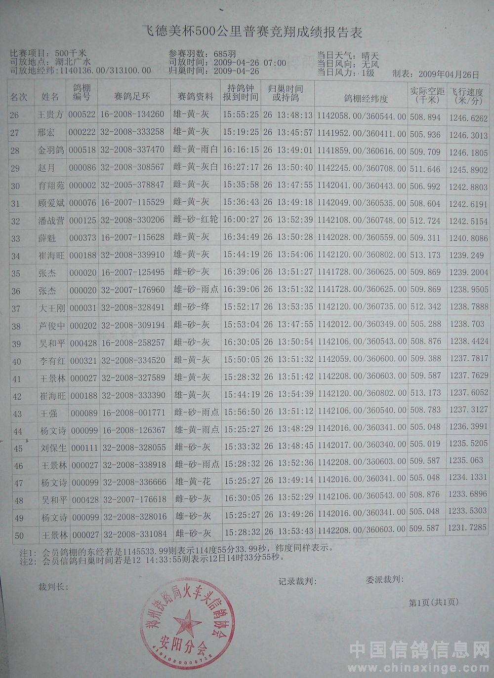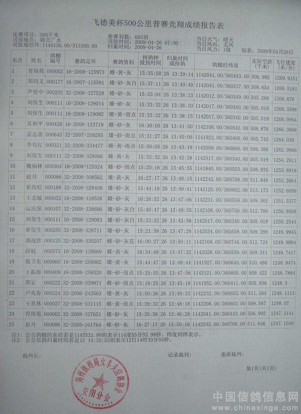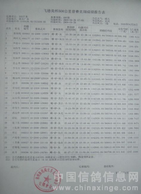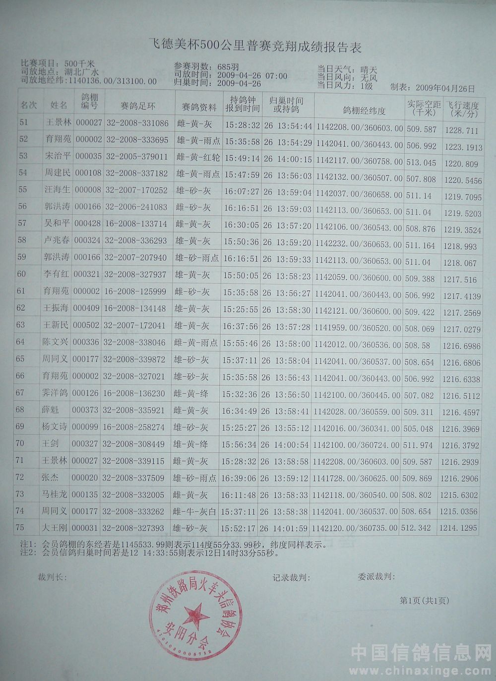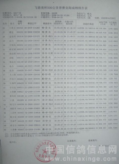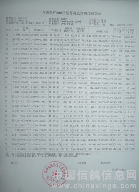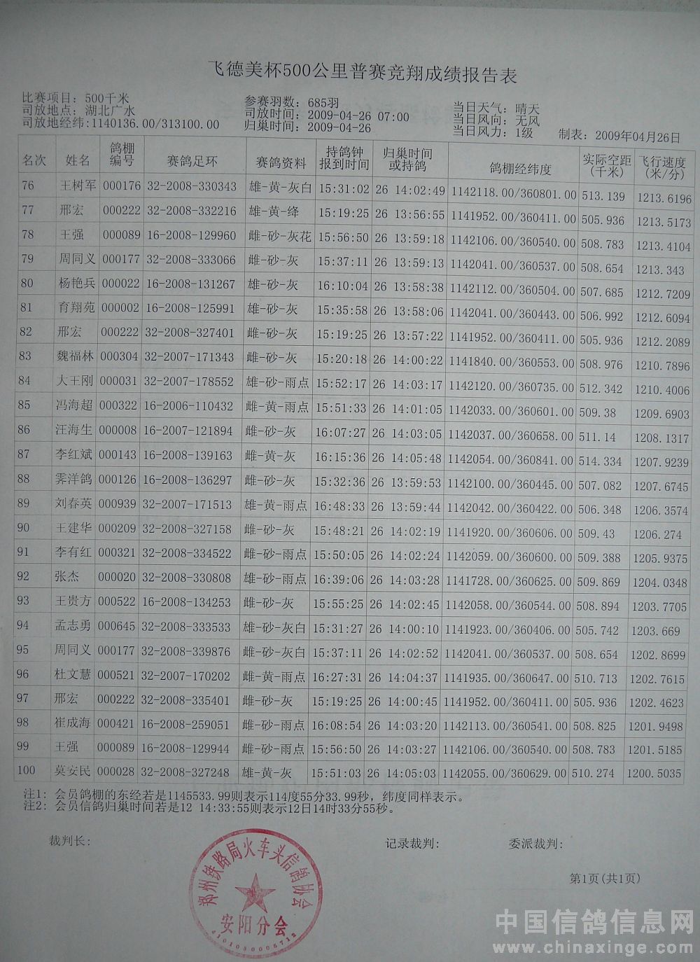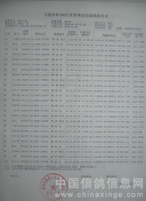 500公里“飞德美杯”1-100名成绩及指定鸽成绩