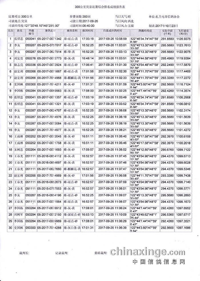 第二十三届中国信鸽 国家赛“ 锡林浩特赛区”成绩报告表