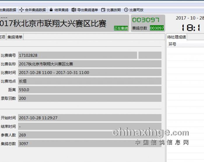 2017秋北京市联翔大兴赛区集鸽:3097羽,训放201羽。