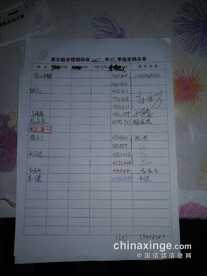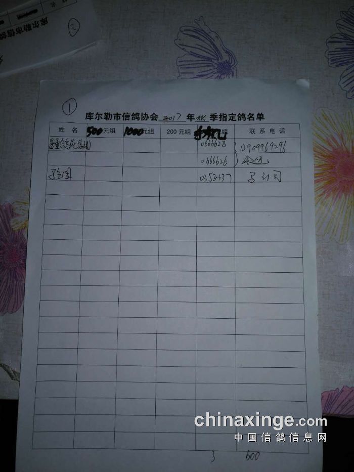 2017年秋季300公里指定鸽明细(500、1000、手机)
