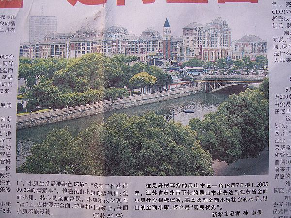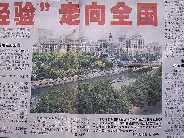 6月17日,新华日报头版重要新闻介绍,从6月14日起,人民日报、新华社、中央电视台、中央人民广播电台等13家中央媒体集中推出昆山全面建设小康社会的典型报道————“‘昆山经验’走向全国”,其中推出一张照片(见下图),与我协会3月20日于中信网《专题图库栏》发布的图像作品,同为一个视景,不知是否巧合?真是“英雄所见略同”!我们感到十分的欣慰!!本协会摄制的图片提名为“蓝天有你更美丽”,我们觉得十分贴切,为让佳图达到共享,目前已成为鸽协的“外交”明信片 ——— 作为协会向曾经支持昆山鸽协开展活动的单位、个人表示谢意的赠送礼品。     记得当年昆山周庄的发现、发展,起因也是由著名画家陈逸飞的一幅油画“故乡的回忆”,经美国大亨哈默转送邓小平后成名,从而,带动了昆山周庄旅游事业大发展!这是昆山抢抓机遇的一个真实体现!目前昆山腾飞,形势逼人,催人奋进!作为昆山社会的一员,我鸽协时刻肩负着一份责任,在这大好形势下,我们要发挥昆山人善抓机遇的特长,只争朝夕,加快发展,不断创新,不辱使命,不负众望,努力把昆山鸽协及其网站建成达到全国一流水平!