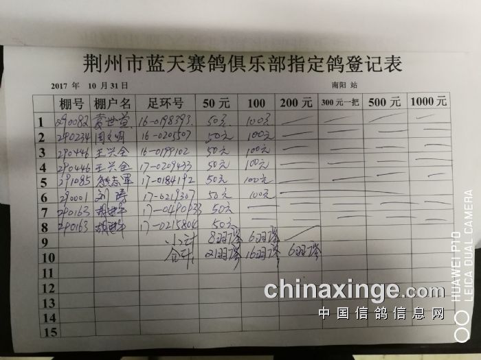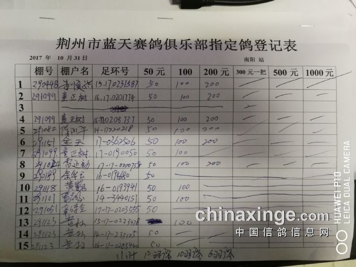 2017年11月1日300公里燎原杯南阳站比赛指定鸽明细