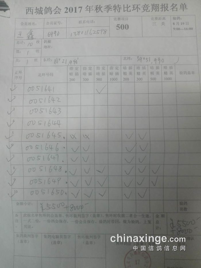 由于工作人员失误,将参赛鸽友王鑫先生 500元特比环单关指定、精英赛单子填错,给鸽友带
