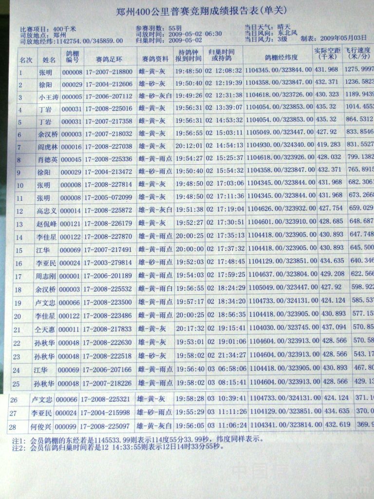 郑州400公里“凯峰完美杯”竞翔成绩