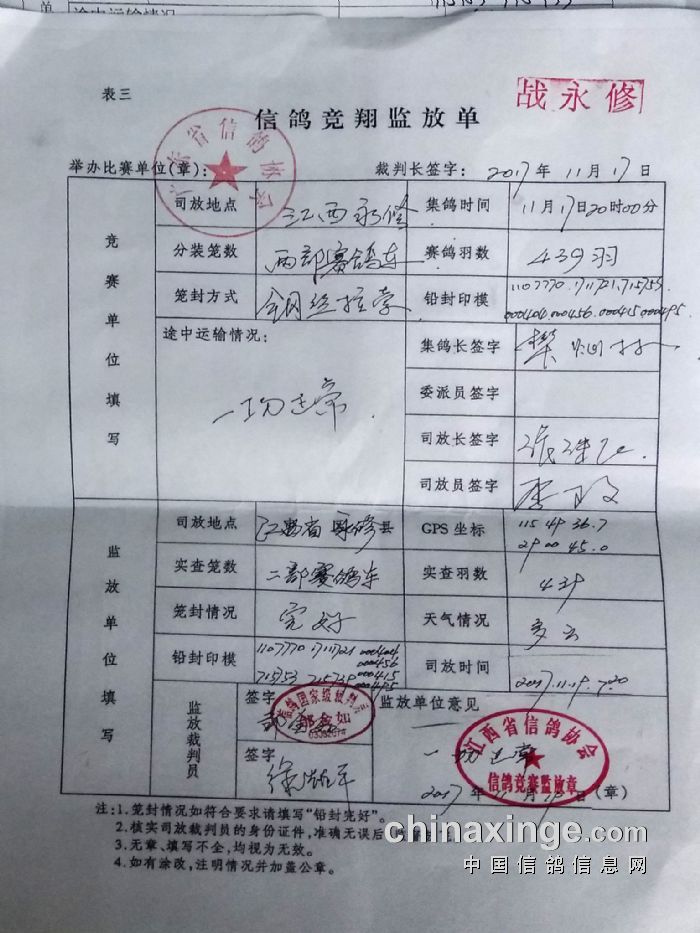 广东省第十二届信鸽竞翔赛于2017年11月19日早晨7:20时在江西永修县开笼,江西省信鸽协会委派了两名裁判进行了现场执裁。