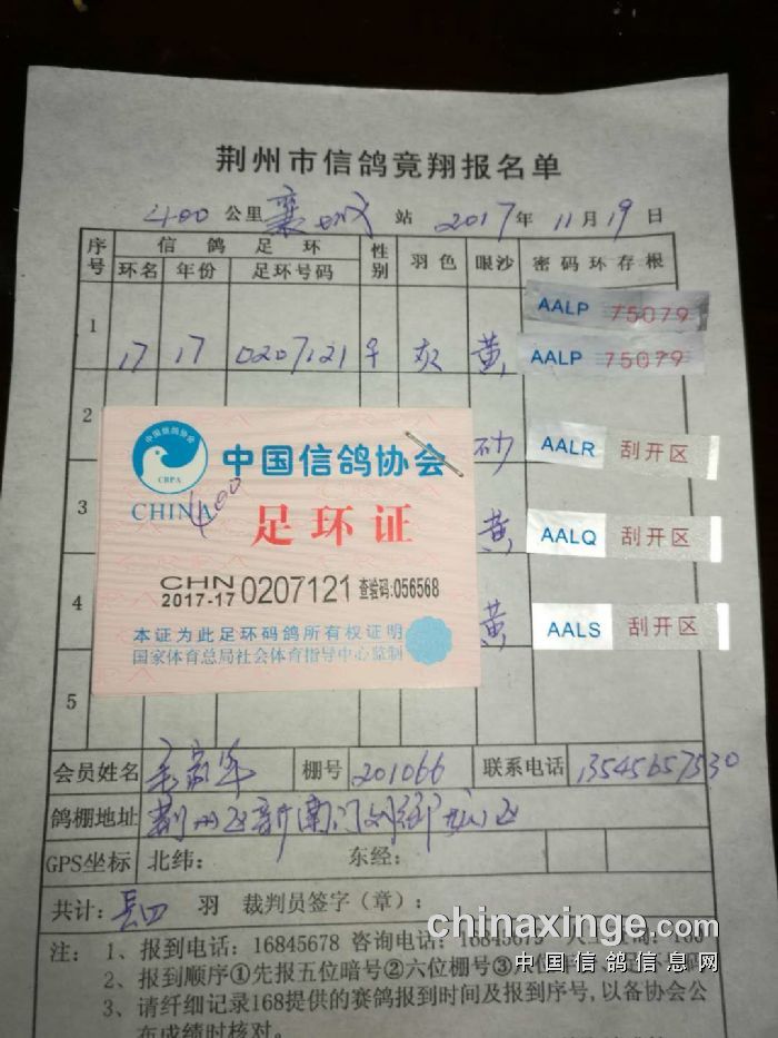 2017年11月22日全国千公里联赛廊坊站比赛集鸽清单