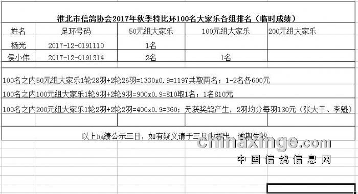 淮北市信鸽协会2017年秋季幼鸽特比环大家乐各组排名
