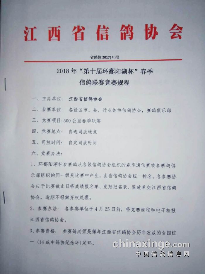 2018年“第十届环鄱阳湖杯”春季 信鸽联赛竞赛规程