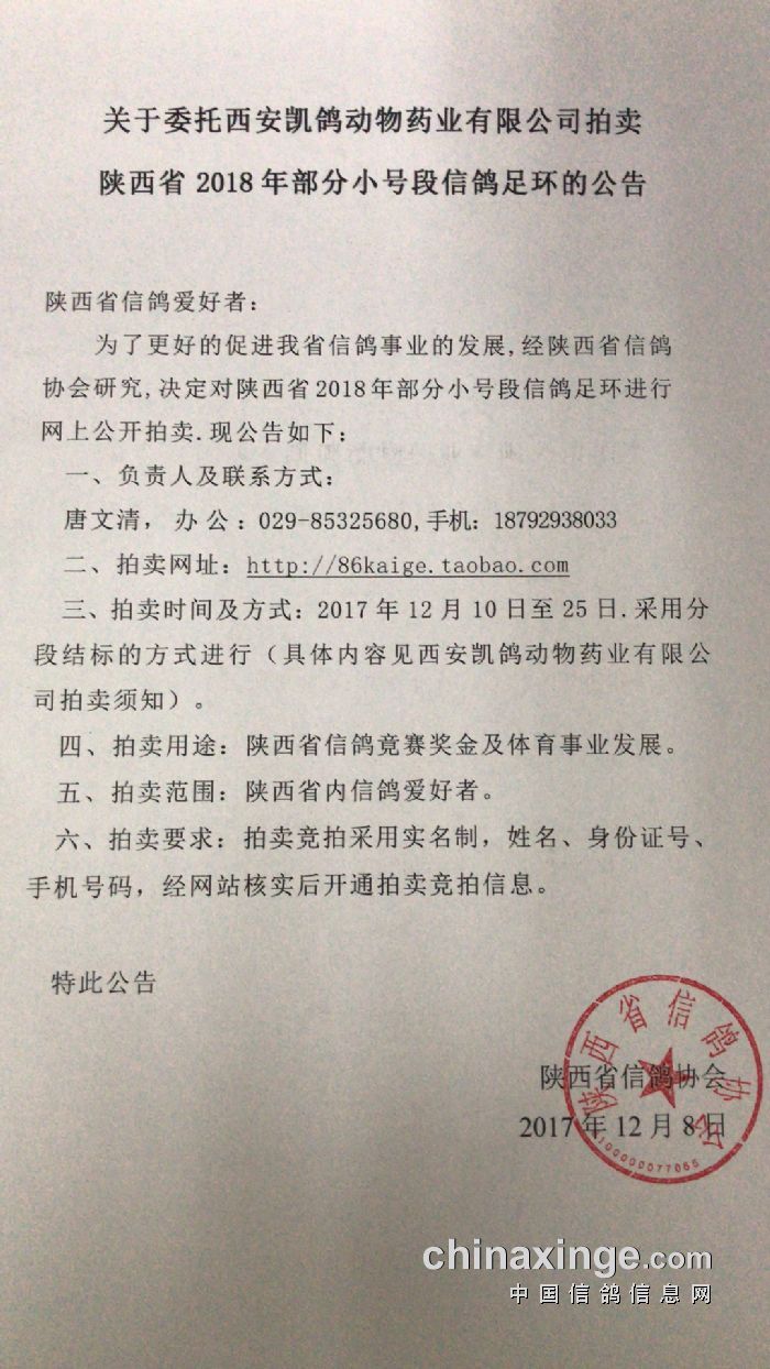 经陕西省信鸽协会研究决定,2018年陕西省信鸽足环1-1000号段向全省信鸽爱好者公开拍卖,信鸽足环拍卖正式上线,拍卖所得款全部用于省信鸽竞赛奖金。