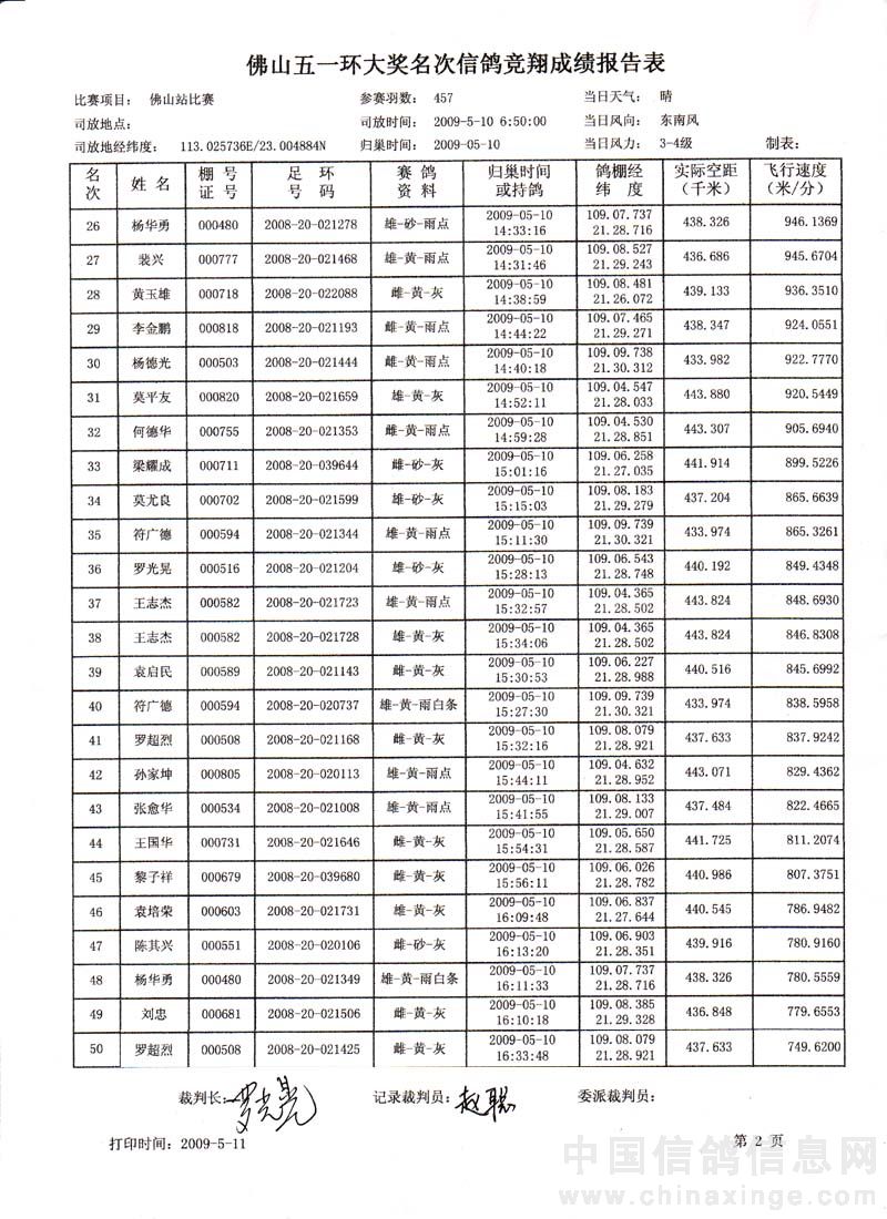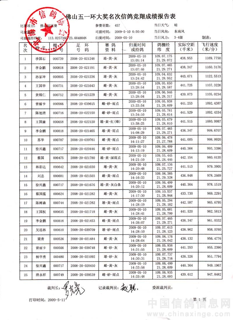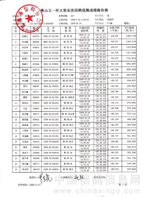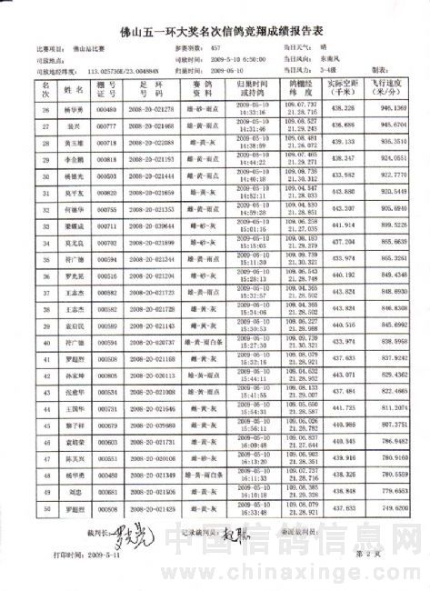 广西北海市信鸽协会2009年上半佛山"五一大奖赛"名次信鸽竞翔成绩报告表