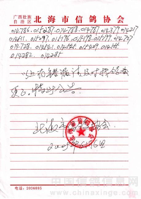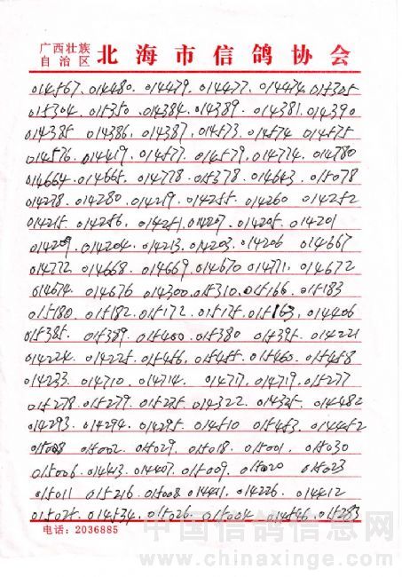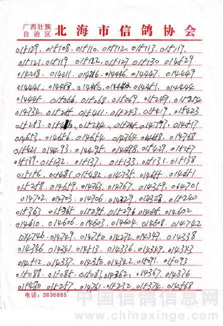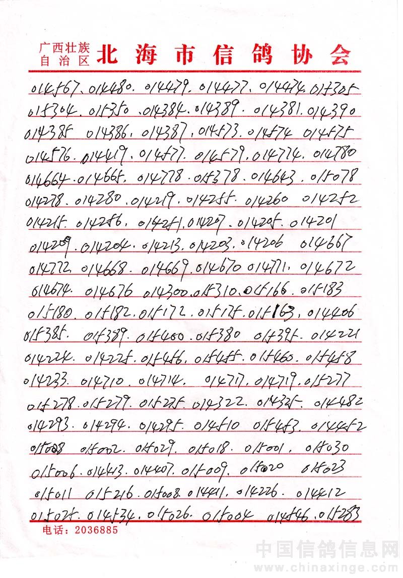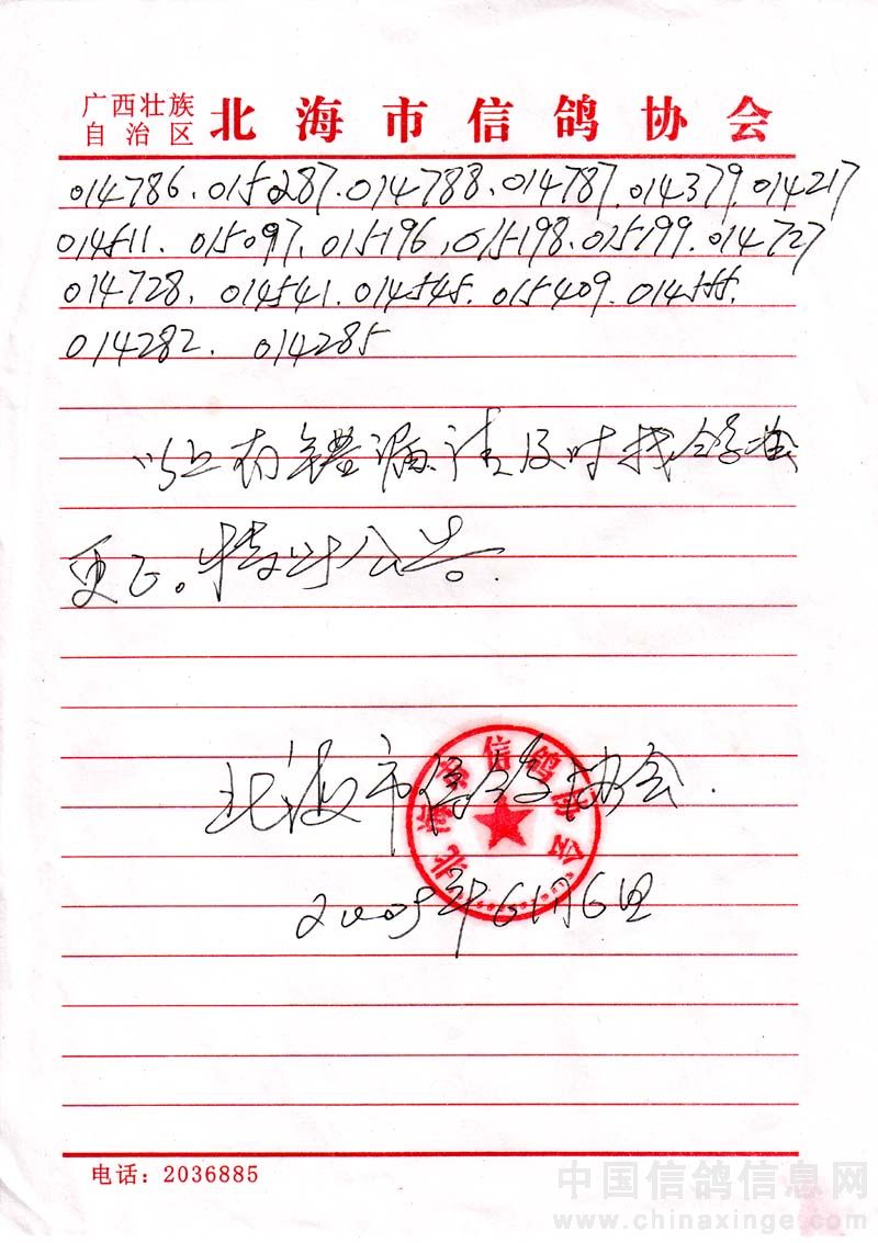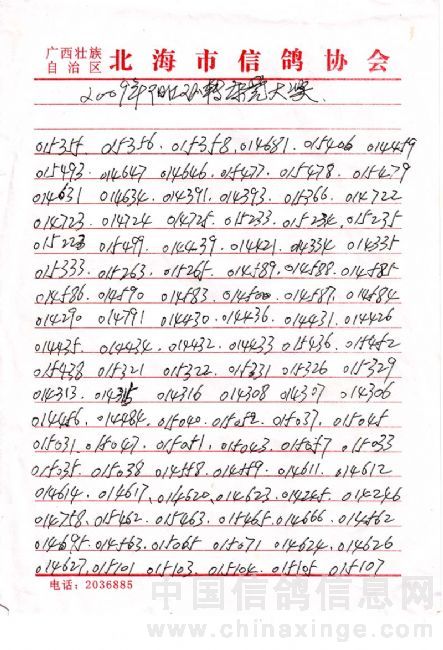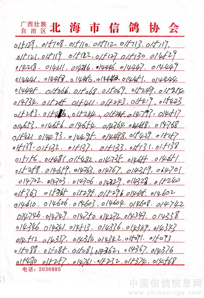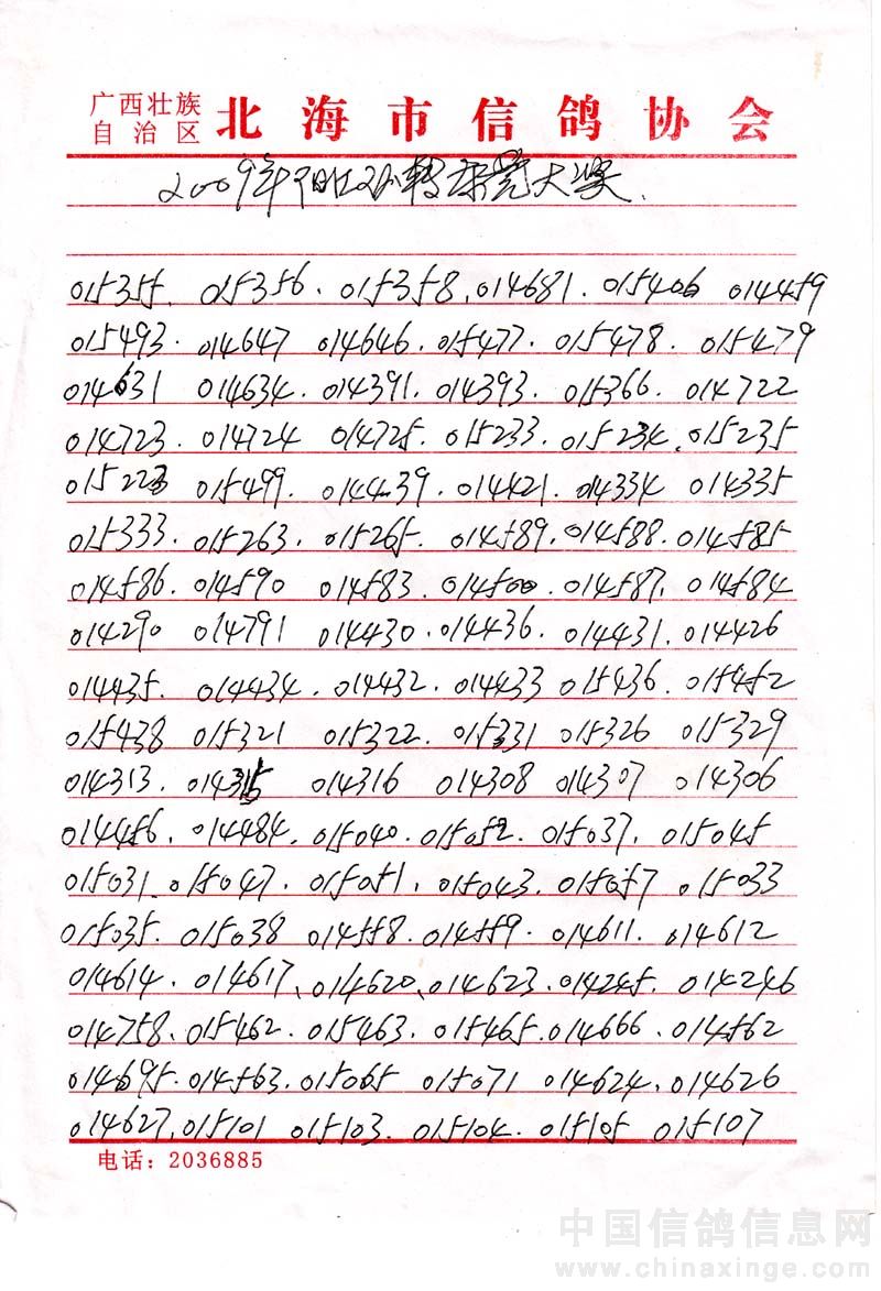 广西北海市信鸽协会2009年上半年阳江环转下半年大奖环名单