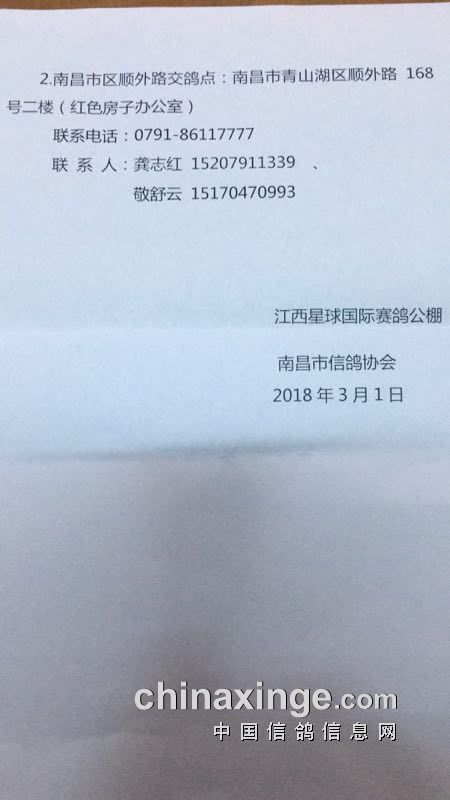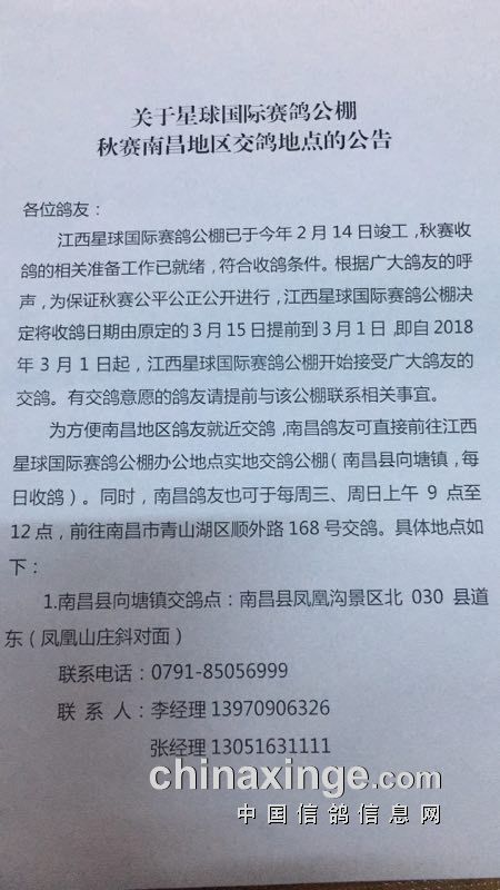 关于星球国际赛鸽公棚秋赛南昌地区交鸽地点的公告