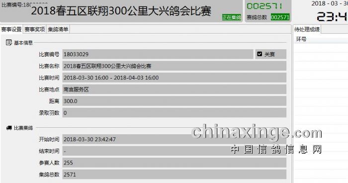 集鸽羽数2571羽,按照规程规定本次比赛,超过2000羽8取1,录取372名。
