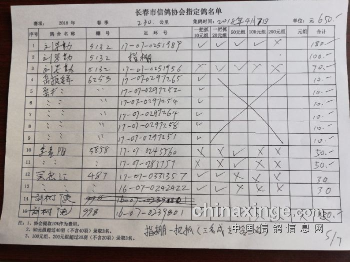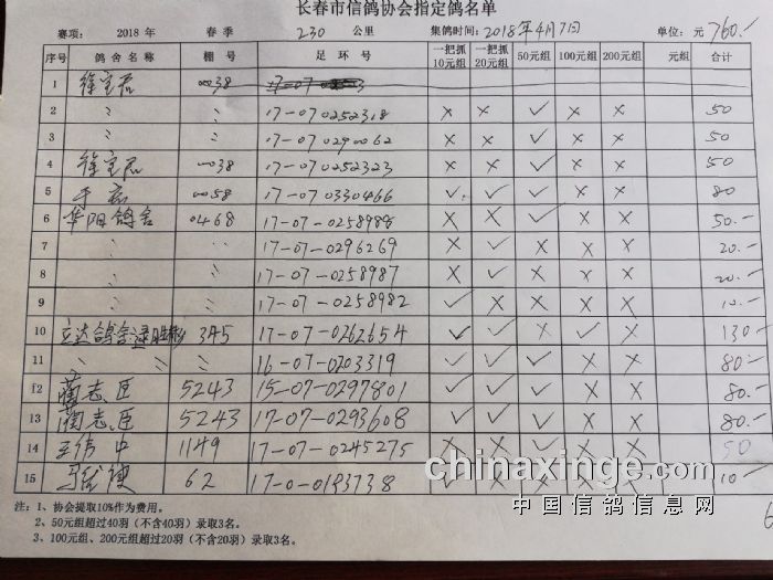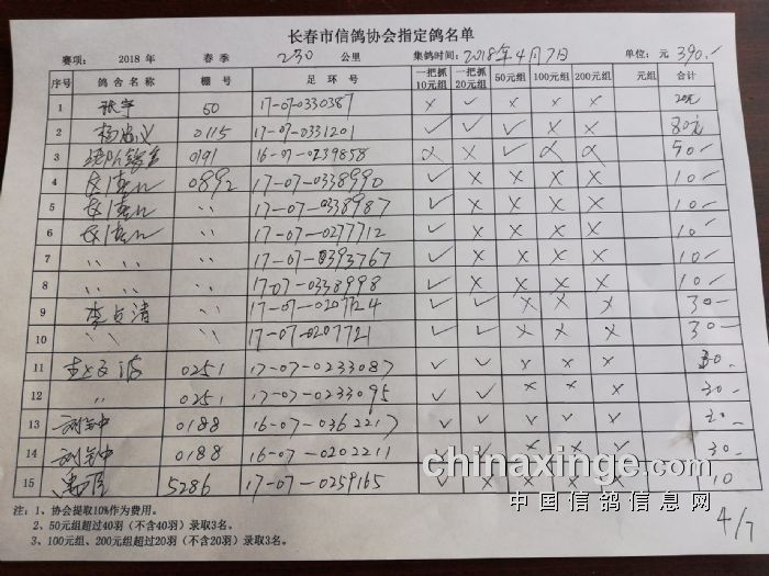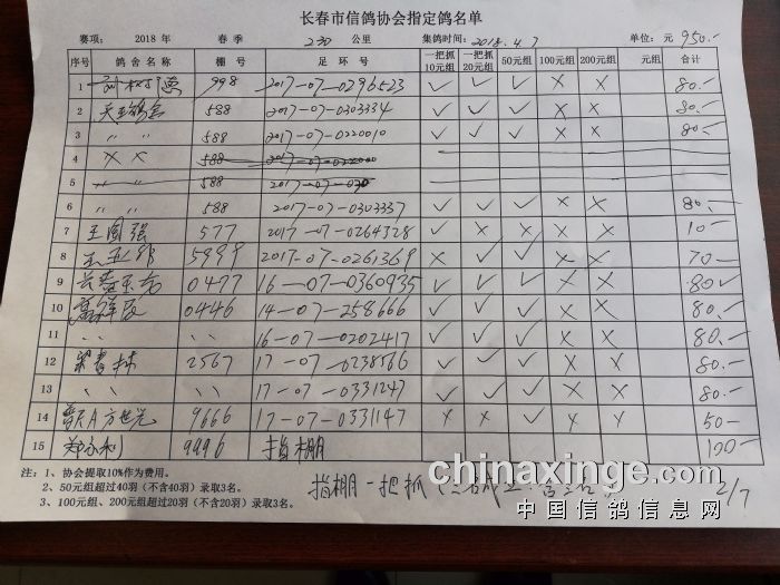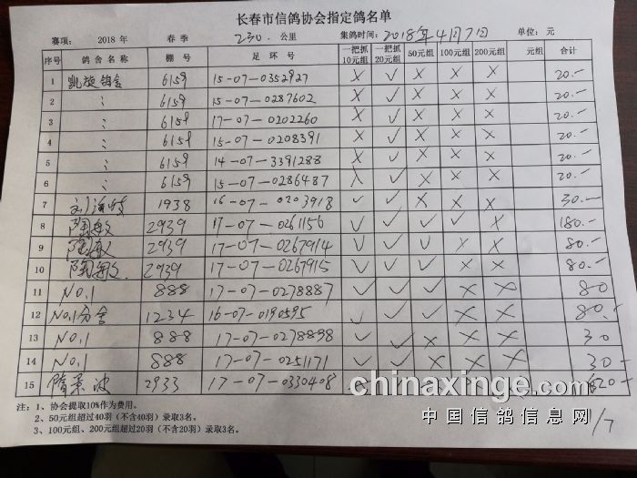 2018年春季230公里比赛指定鸽明细