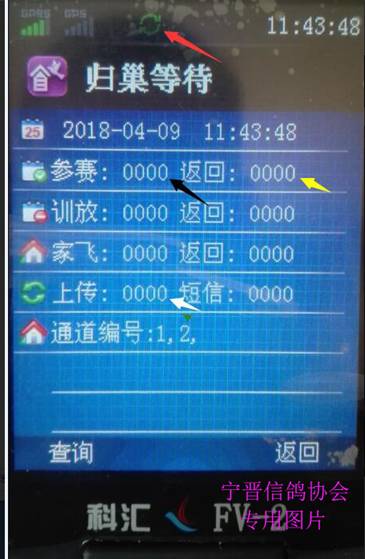 ③ 黄色箭头所指位置显示的数字表示本次比赛归巢羽数