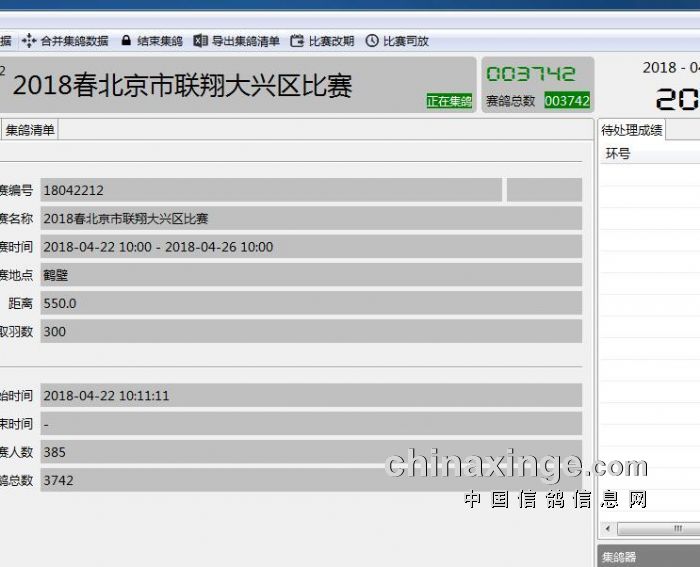 2018春北京市联翔大兴赛区集鸽参赛3742羽,训放650羽。共计4392羽。
