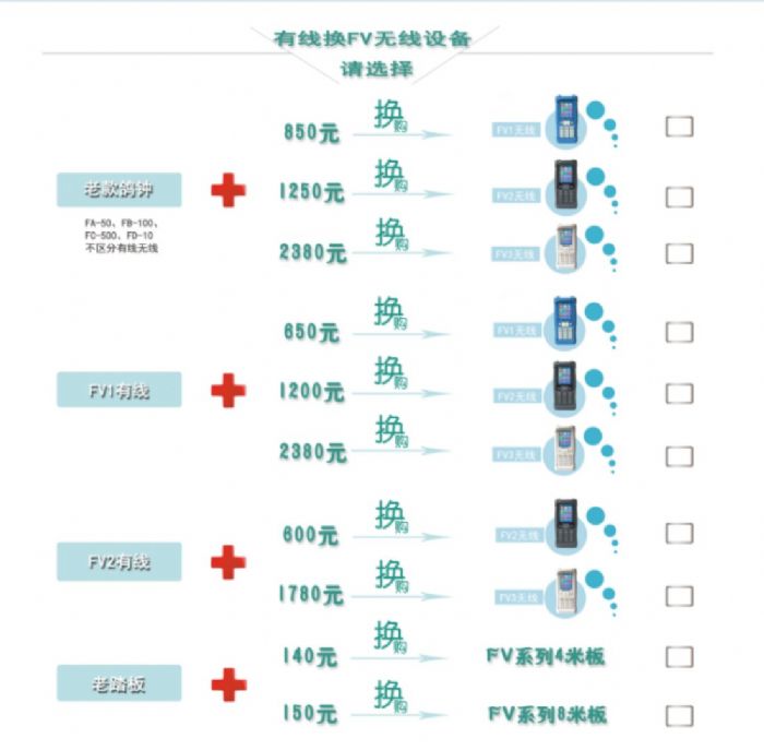 即日起,科汇公司老产品(FA、FB、FC、FD,不区分有线无线)、FV系列有线产品可更换FV无线产品(FV1无线、FV-2无线、FV-3无线),FV无线可换更高一型号无线产品,置换具体价格如下: