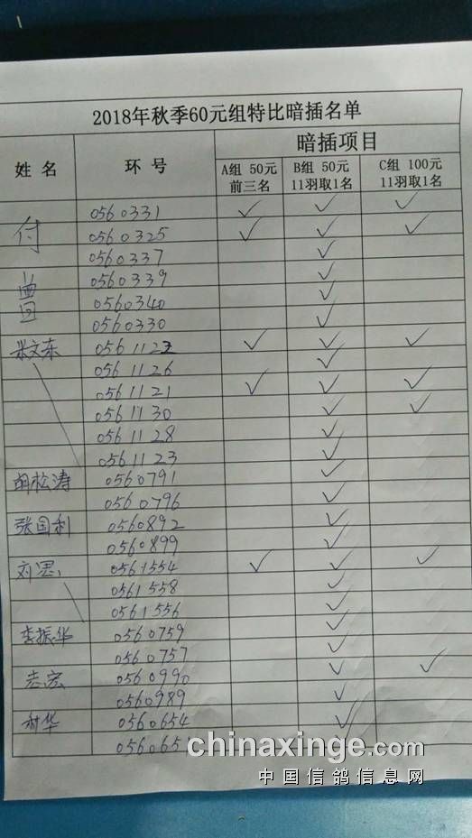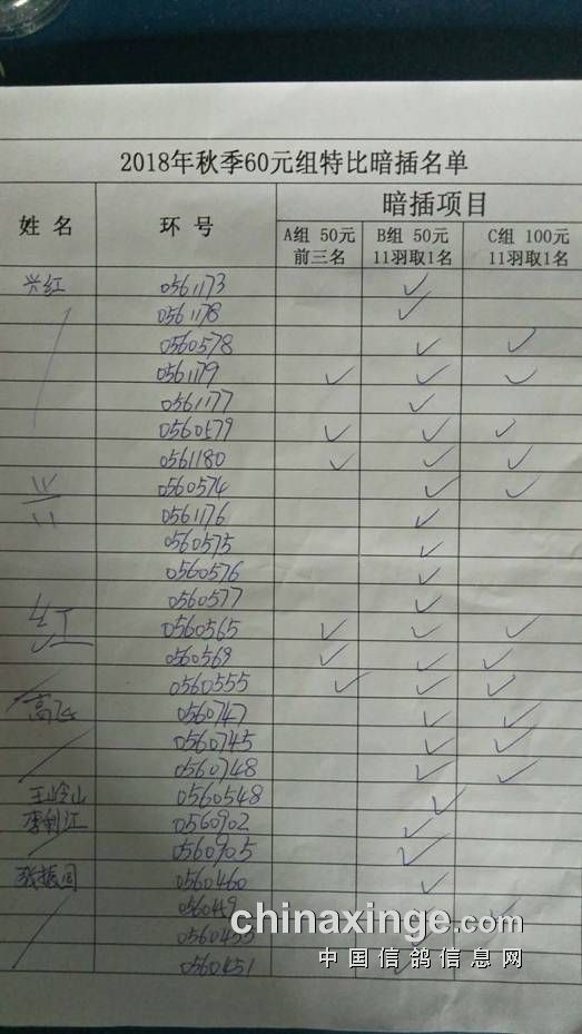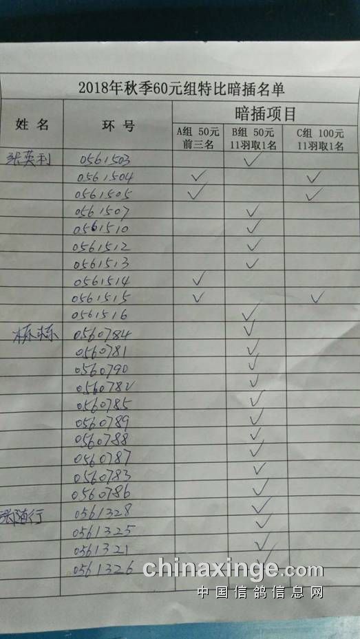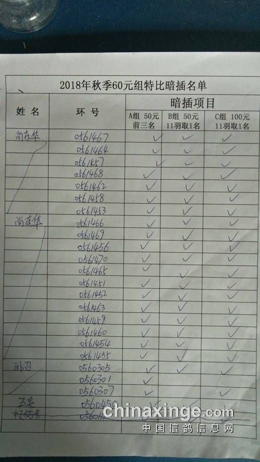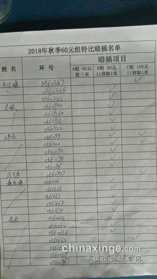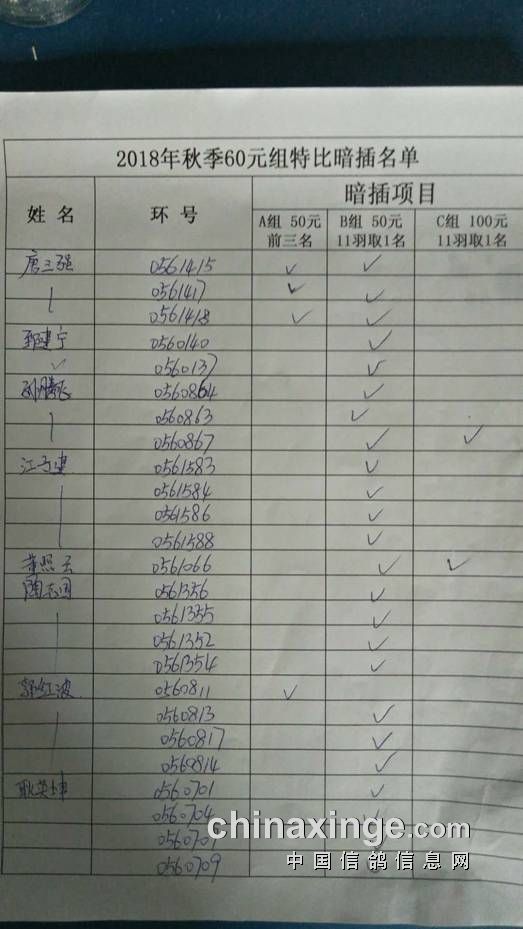 C组100元 11羽取1名,共暗插123羽,取前12名