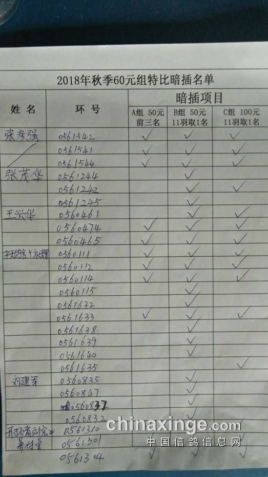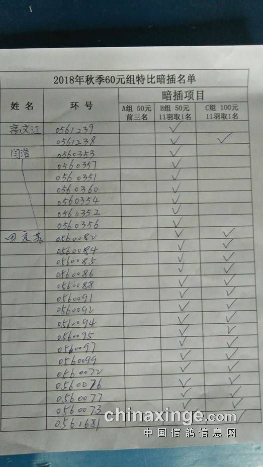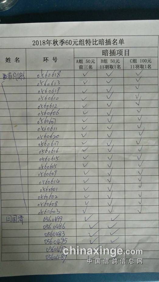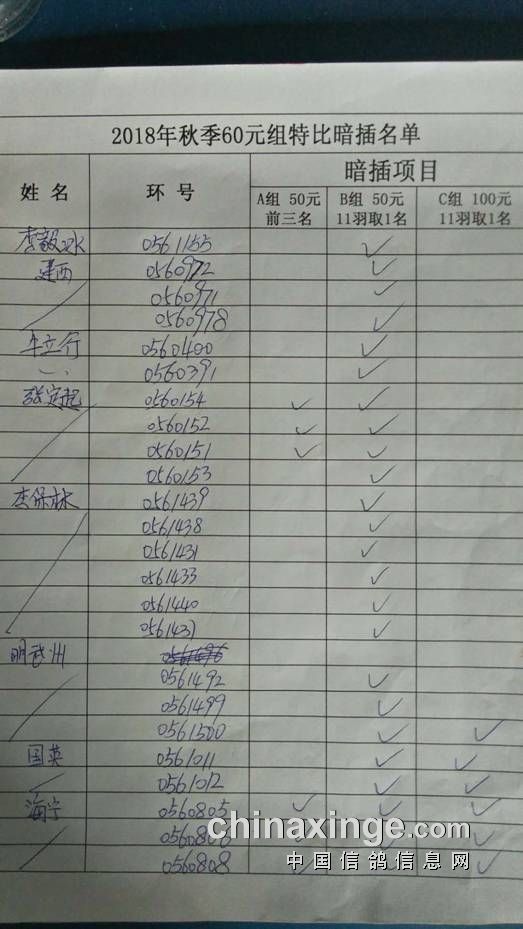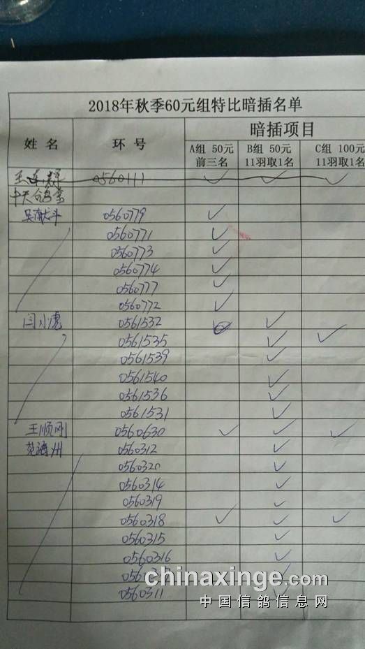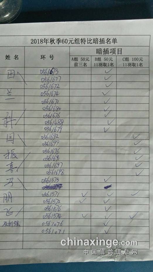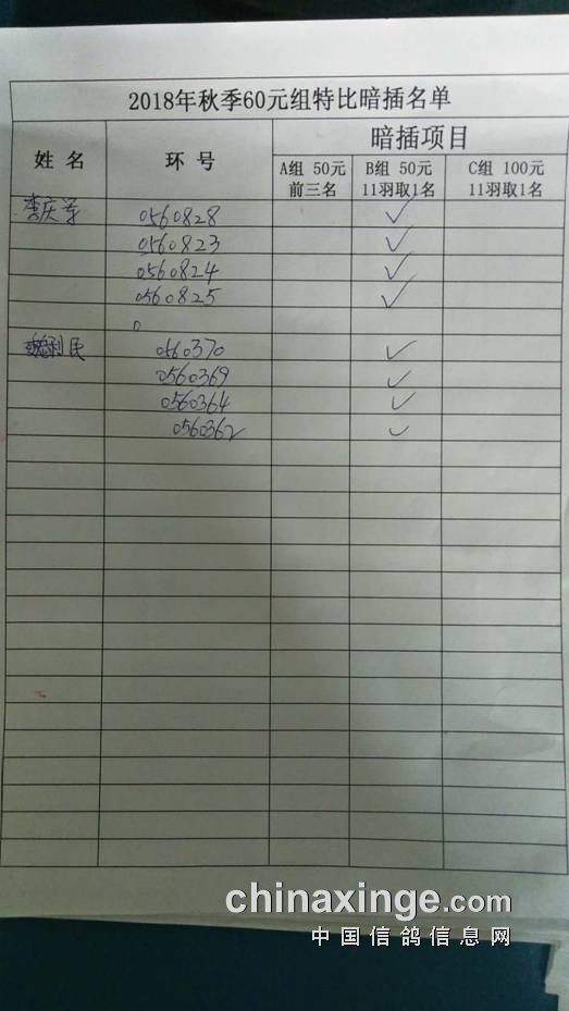 C组100元 11羽取1名,共暗插123羽,取前12名