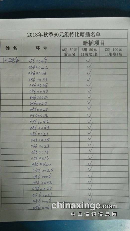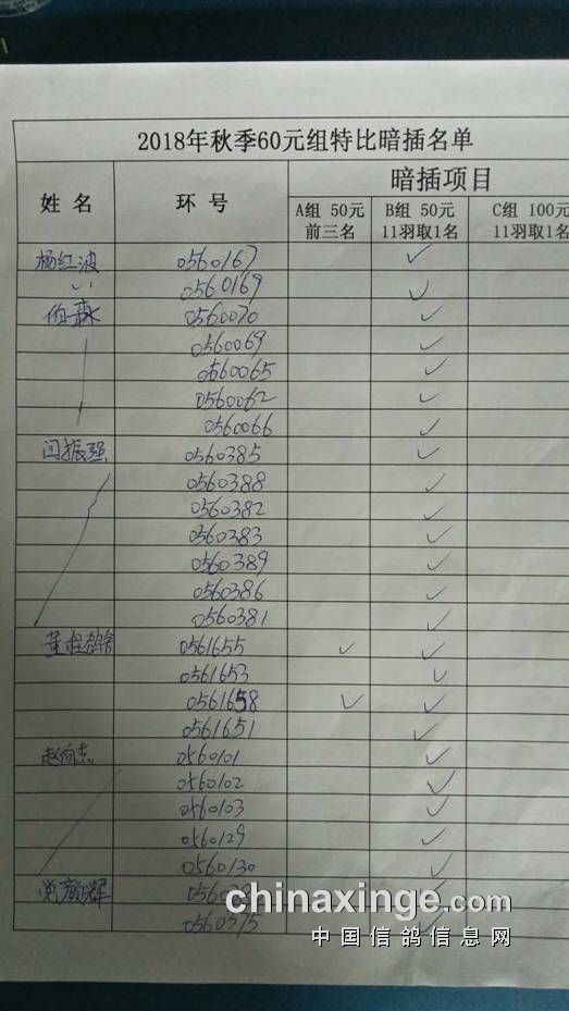 B组50元 11羽取1名,共暗插329羽,取前30名