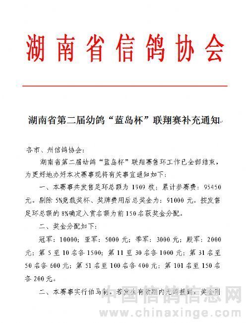 湖南省第二届幼鸽“蓝岛杯”联翔赛补充通知