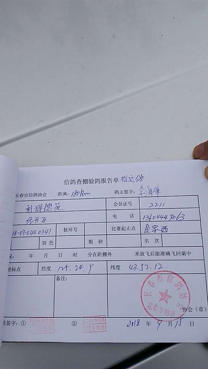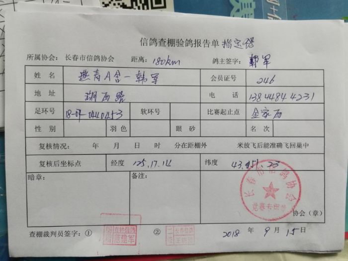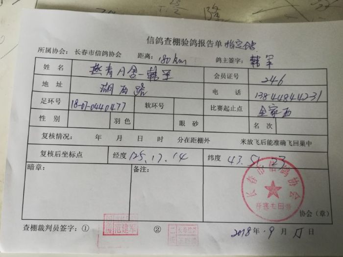 2018年秋季180公里指定鸽抽验