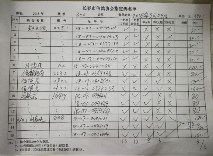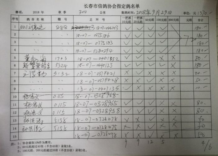 2018年秋季300公里第二站暨大奖第二关比赛指定鸽明细