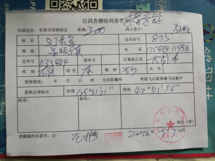 2018年秋季300公里第二站暨大奖第二关指定鸽验棚