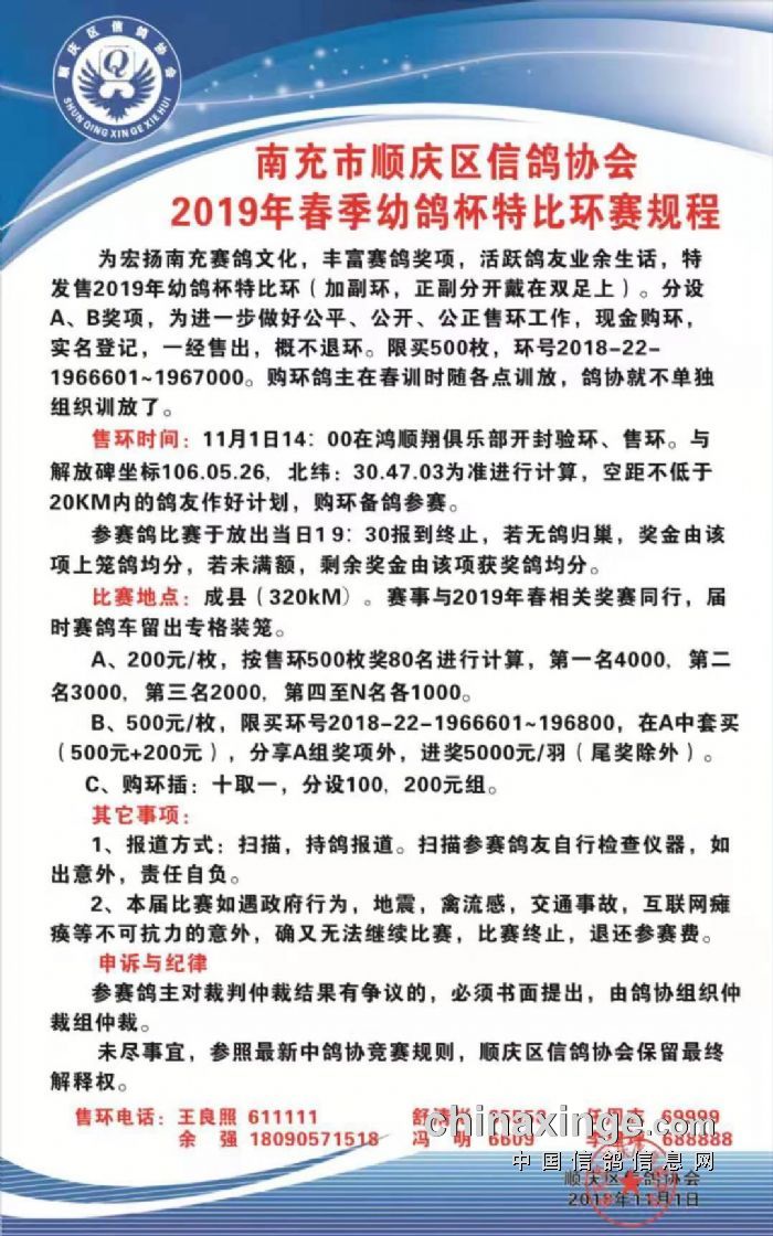 顺庆鸽协2019年春四关鸽王争霸赛暨春赛安排规程