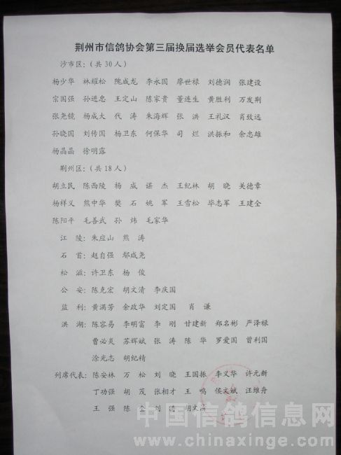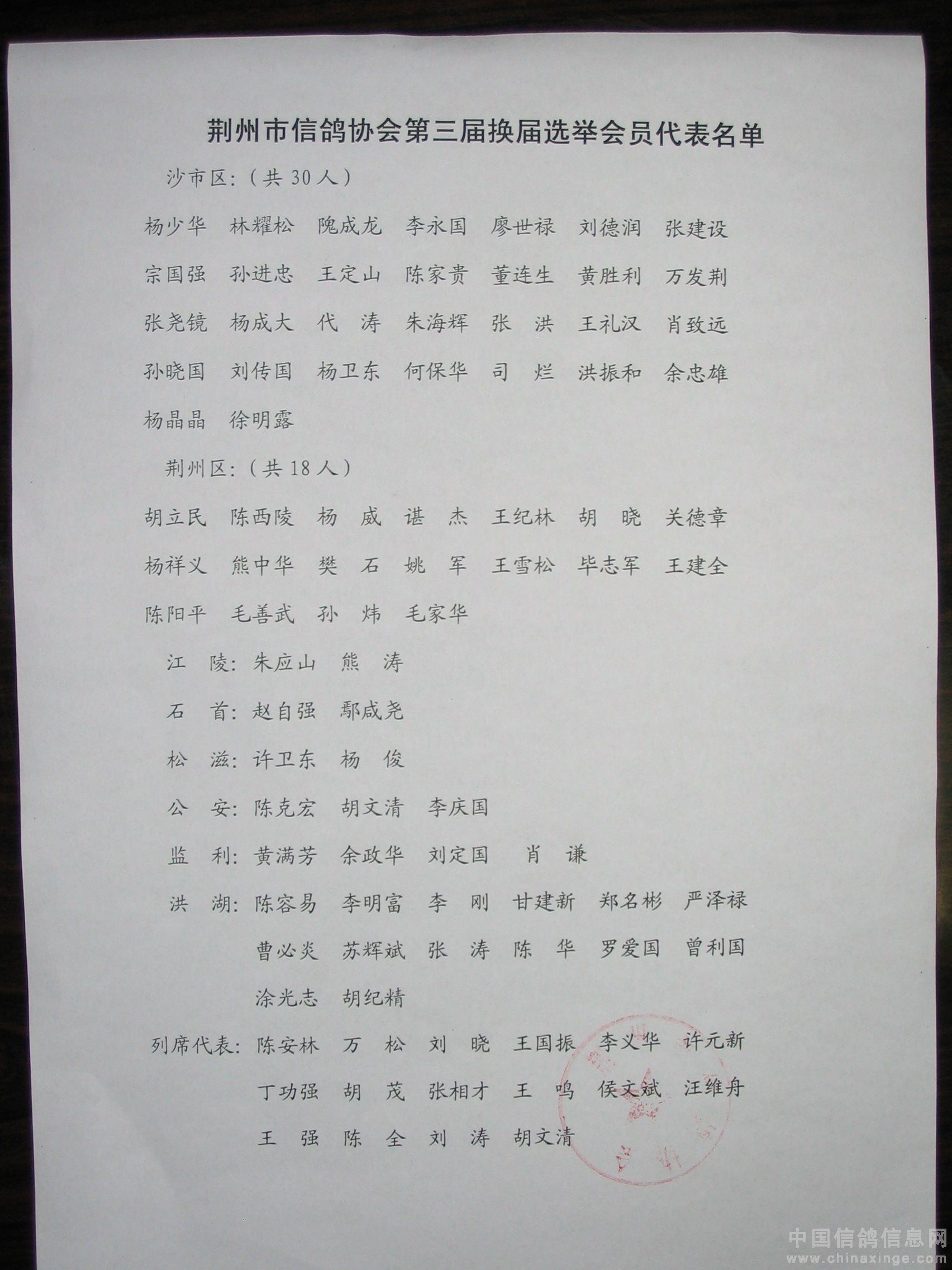 参加荆州市信鸽协会第三届换届选举会员代表名单