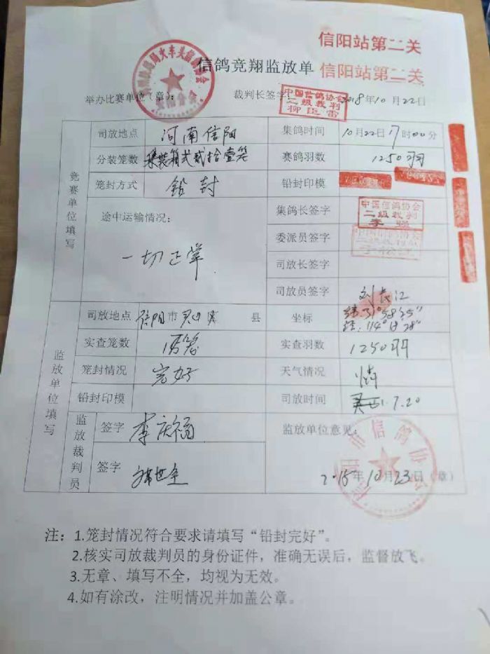 2018年秋季450公里信阳站于今早07:20开笼,司放地天气晴,预祝鸽友取得好成绩。