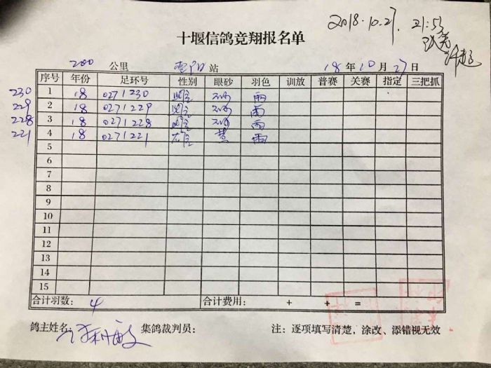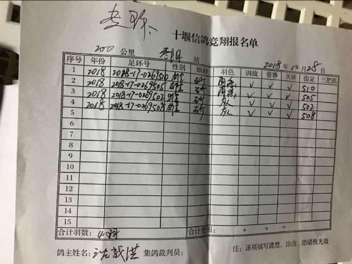 按照协会规程,500公里幼鸽专环免费指定赛200公里上笼前必须填写参赛鸽资料入笼,因为鸽友:沈茂洪,付利敏鸽钟出现故障返厂维修未能正常经过集鸽器扫描上笼,但是参加免费指定赛鸽已填写竞翔单缴费入笼,所以此参赛鸽免费指定赛真实有效,特此说明!