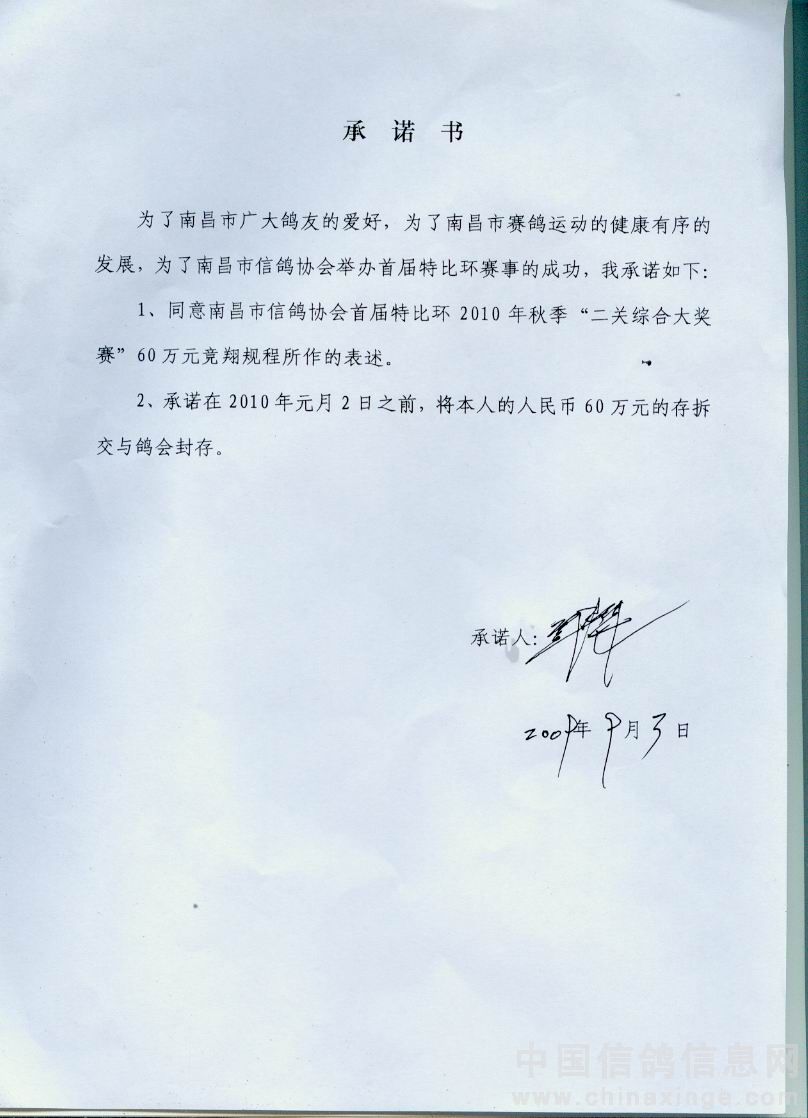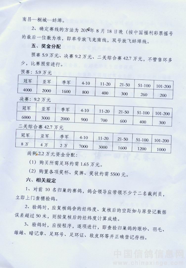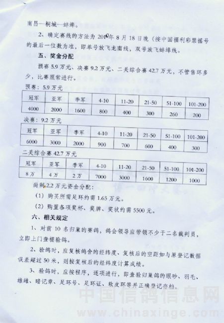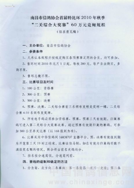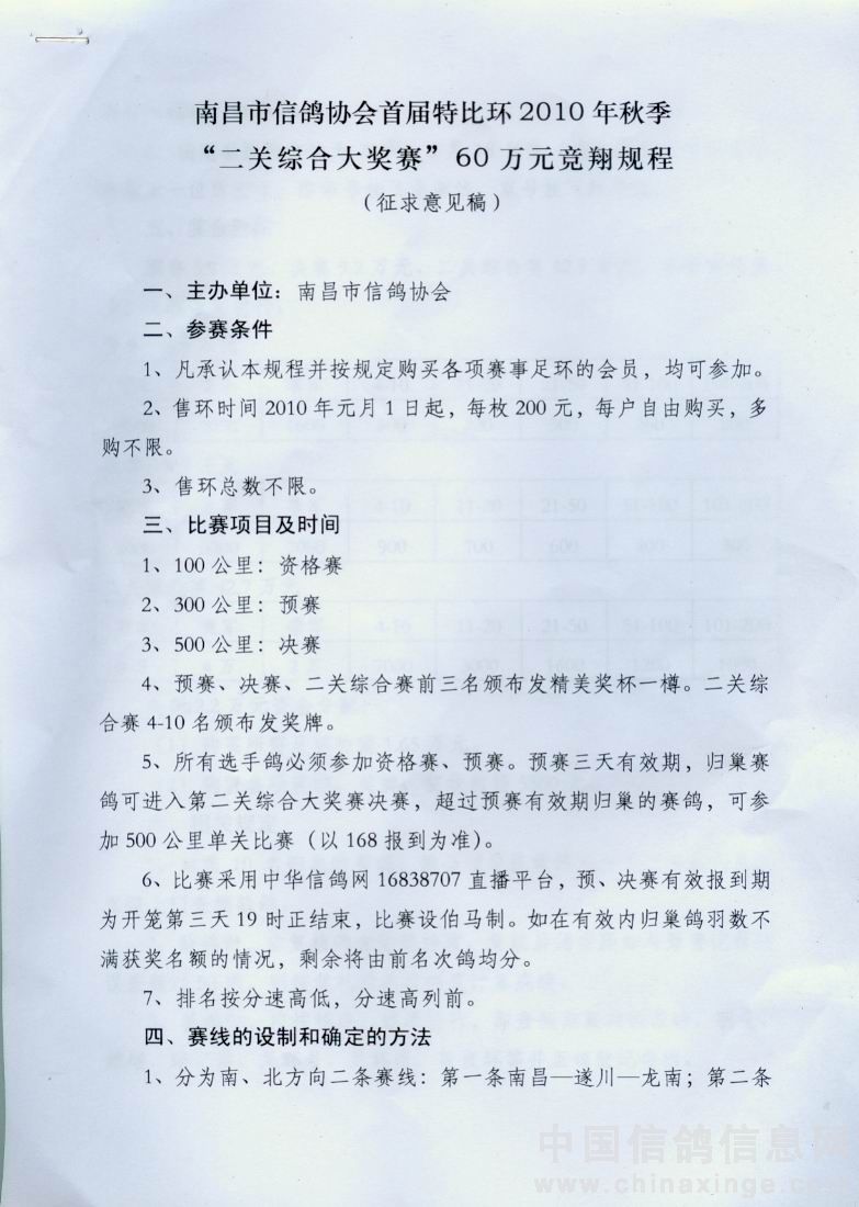 南昌市信鸽协会2010年秋季首届“二关综合大奖赛”60万元竞翔规程