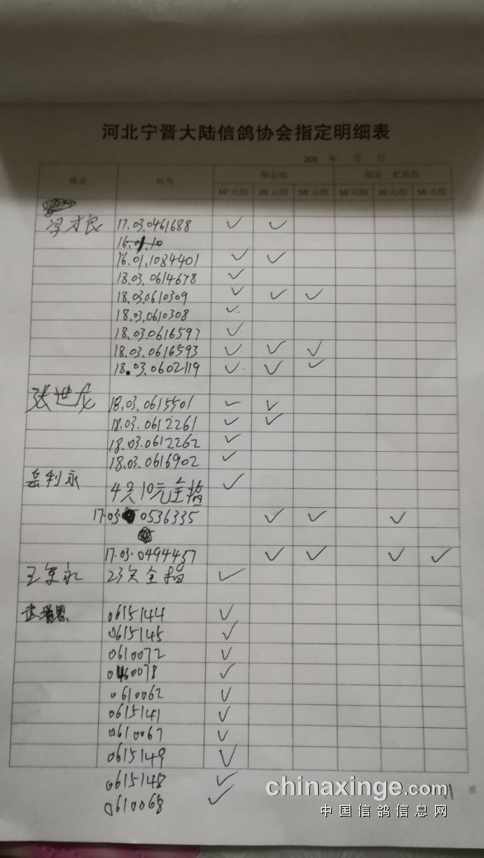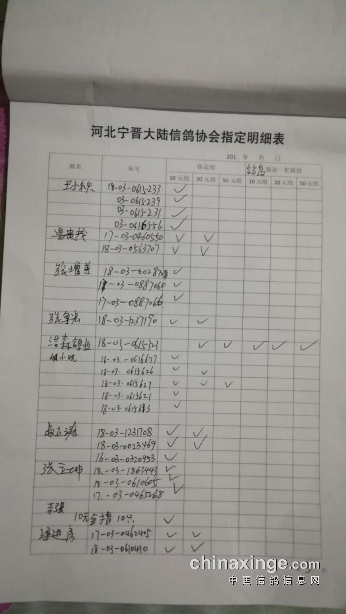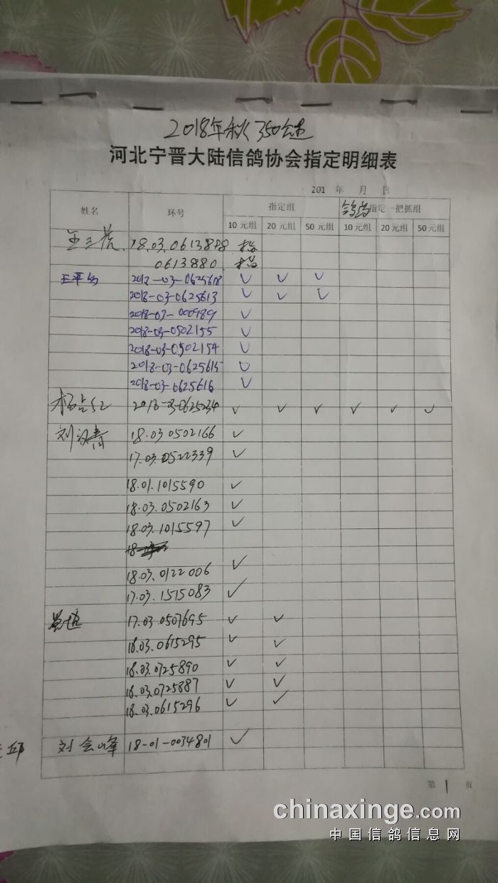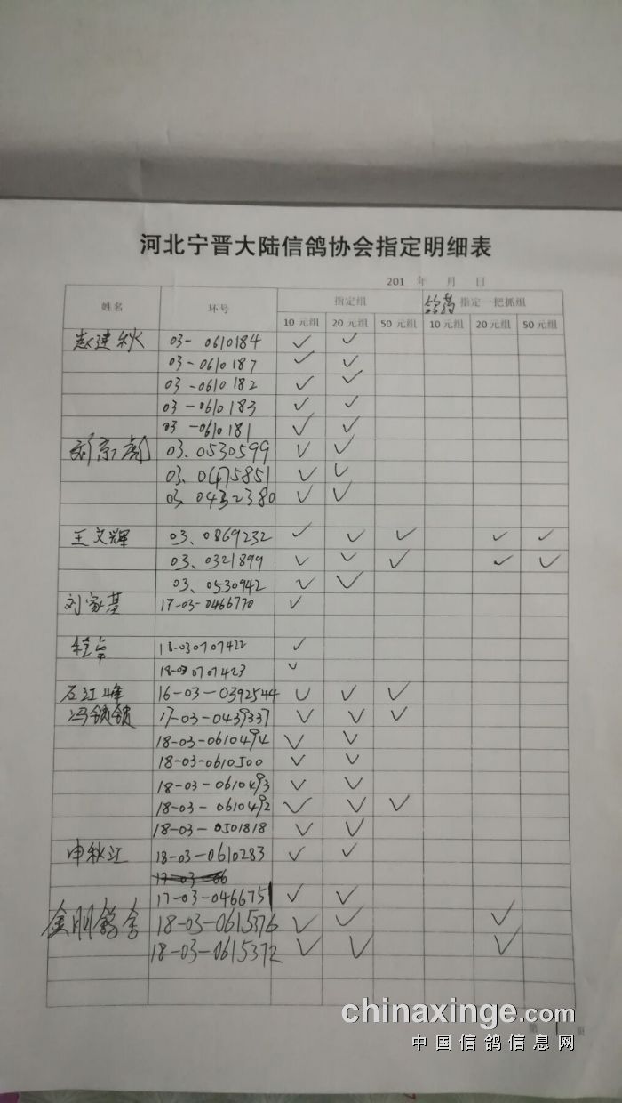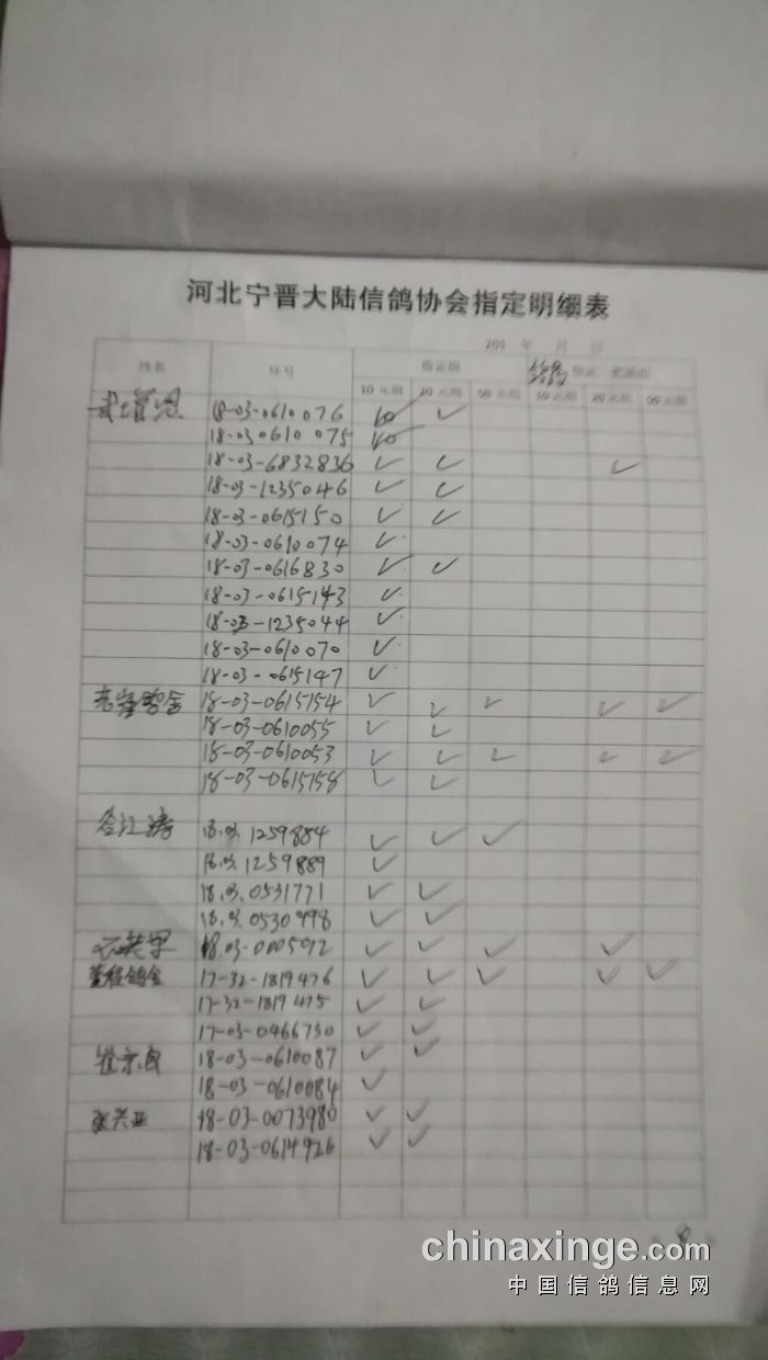 宁晋县大陆信鸽协会2018年秋季350公里指定清单