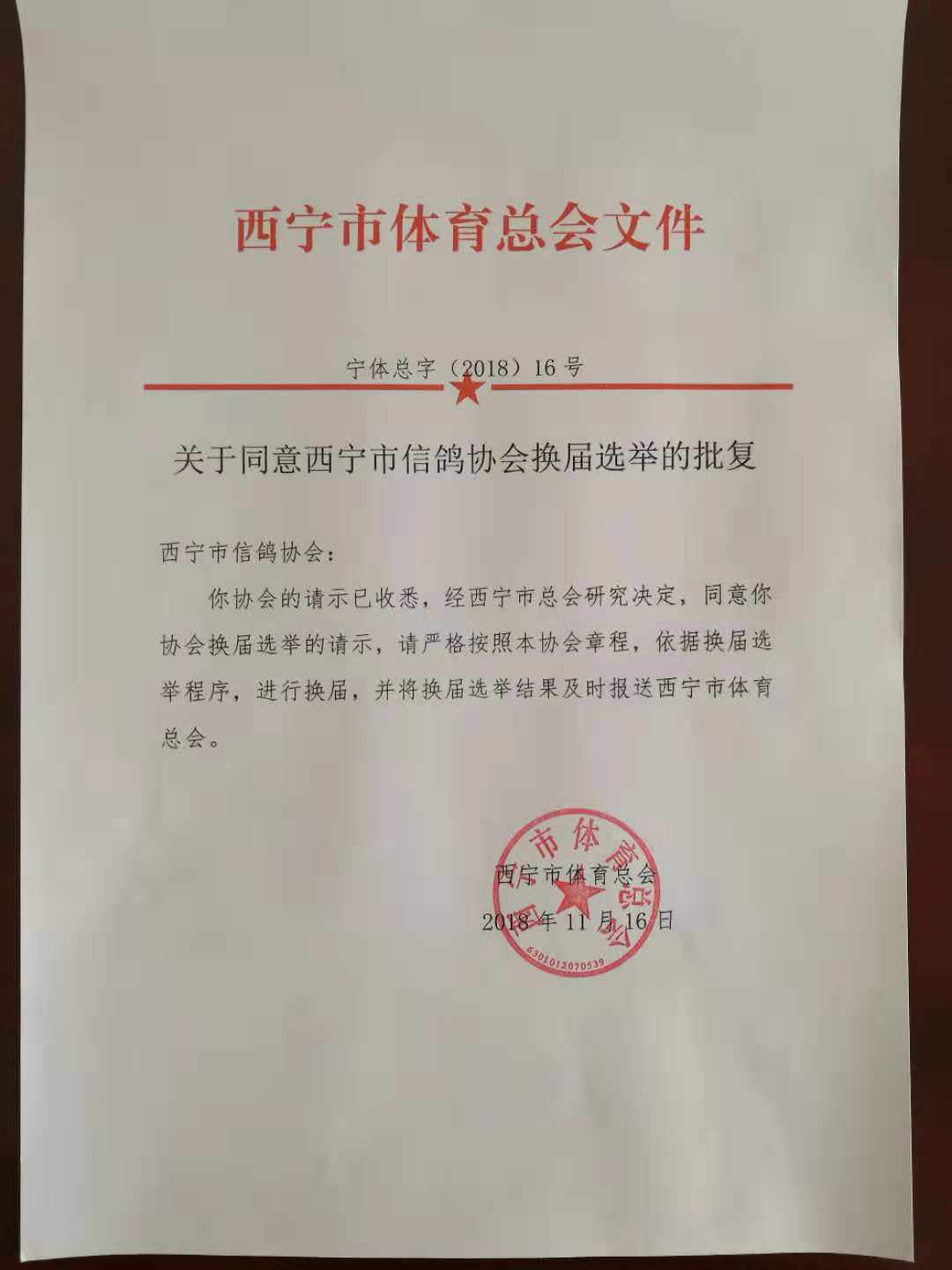 2、西宁市体育总会《关于同意西宁市信鸽协会换届选举的批复》