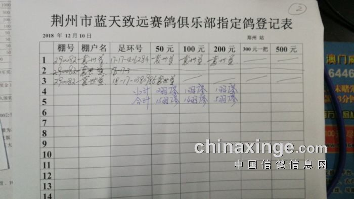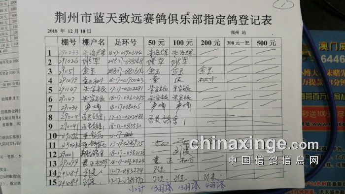 2018年秋12月11日520公里郑州站年度王中王比赛指定鸽明细