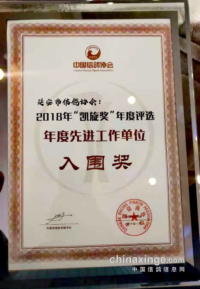 2019年3月9日,在西安市举办2018中国信鸽产业高峰论坛暨“凯旋奖”年度评选颁奖盛典中,延安市信鸽协会获得“2018年度先进工作单位入围奖”。举办此次颁奖活动的目的是提升信鸽行业的社会地位,养鸽人的自信心和自豪感,进而促进我国信鸽事业的健康发展。