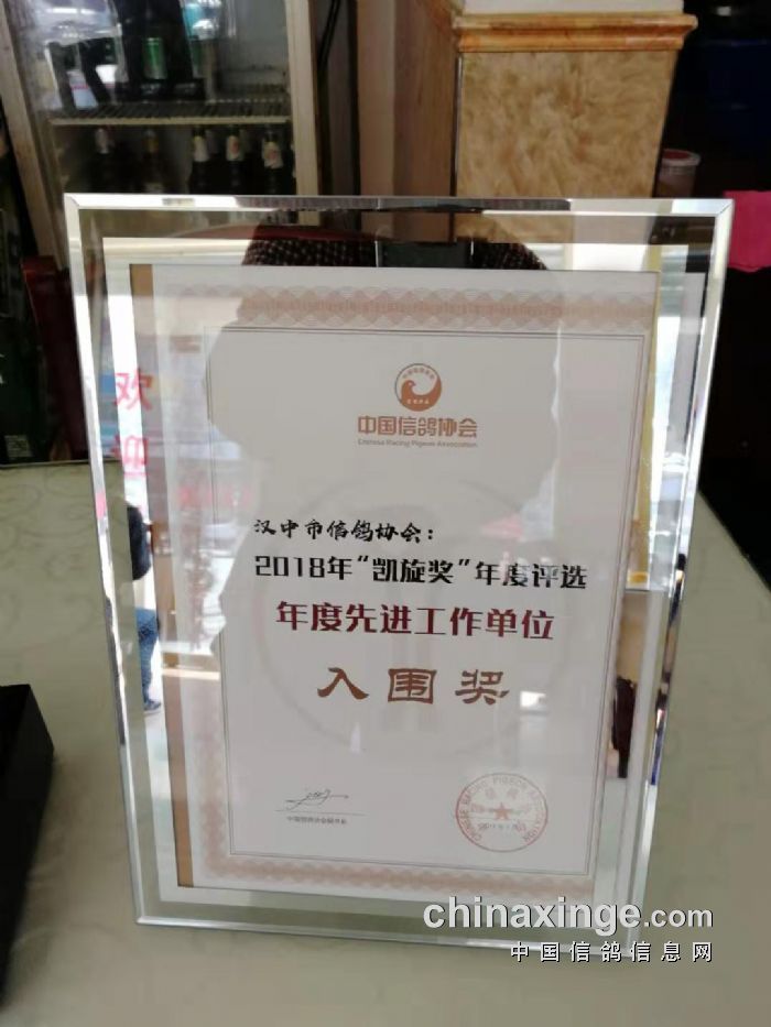 热烈恭贺汉中市信鸽协会评选为2018年凯旋奖年度先进工作单位,这是建会有史以来获得的最高荣誉,由中国信鸽协会直接颁发。陕西省唯一一个被评选的协会。获得此项殊荣离不开汉中各位会员的大力支持及体育局领导的关心,协会会在以后的工作中更加努力认真做好每一件事情,给大家提供一个好平台。希望在今后也继续得到各位会员对协会的大力支持及关心。谢谢大家!