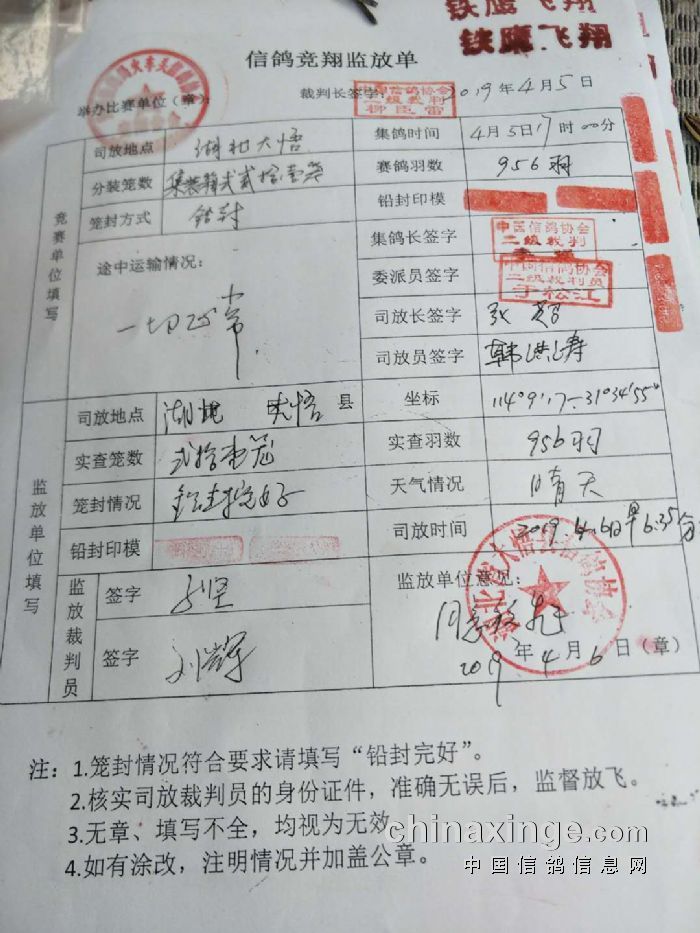 2019年春500公里第三关大悟站今早6:35分在湖北大悟开笼,司放地天气晴,东北风,3级。赛鸽定向良好。距鸽会约498公里。各项比赛数据已上网,会员可上网查看。请会员提前检测鸽种,电子鸽钟属于电子产品,由于各种原因,随时都可能出现故障(如漏扫,不上传等现象),你在自愿购买时必须有所准备,集鸽前做好电子环,上传电话卡的检测(最好使用中国移动卡并开通GPRS功能),确保卡内话费余额充足,赛时尽早使鸽钟通电以免操作匆忙导致卫星定位及校时不准而致上传失误。个人操作失误致数据不准或不上传数据者,造成赛鸽无成绩协会概不负责。预祝参赛鸽友赛出好成绩。