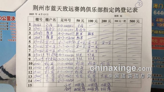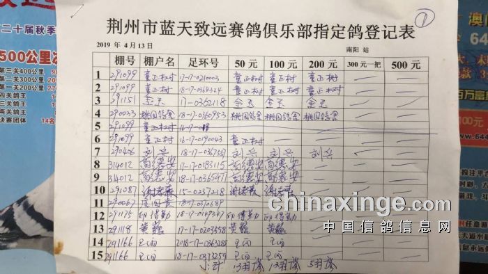 2019年春4月13日300公里南阳站比赛指定鸽明细